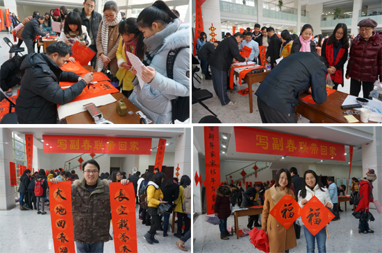 春节回家捎点啥,写幅春联带回家。1月6日下午,由校党委宣传部、校工会、校团委共同主办的“写副春联带回家”活动在学术中心一楼大厅举行。此次活动吸引了广大师生员工的积极参与。校教工书协、学生书法社、工商书画的志愿者热情服务,一些师生自己挥毫,此次活动共写赠春联千余幅。