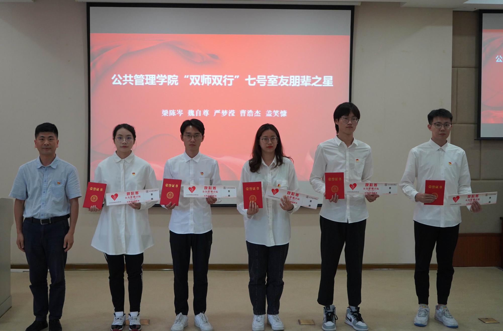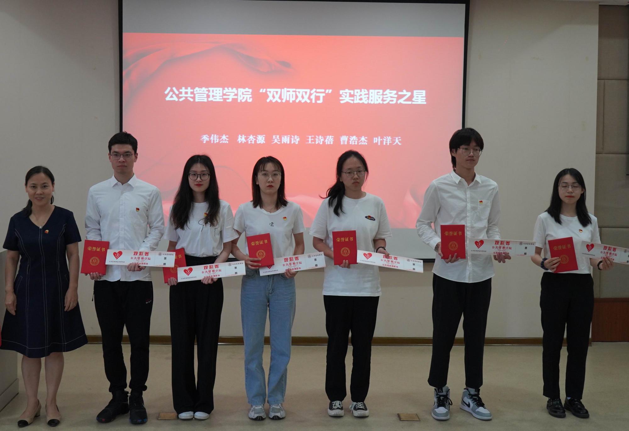 宣誓结束后,学院对近一年来涌现出的学生优秀党员进行了表彰。黄建新为在全国“挑战杯”红色专项赛中勇夺全国一等奖的团队颁奖。学院领导班子分别为获得“双师双行”实践服务之星、七号室友朋辈之星、考研之星和学术之星等荣誉称号的同学颁奖。他们中有的用志愿服务诠释党员担当,在街道社区、杭州图书馆、火车东站都留下忙碌的身影;有的深入寝室嘘寒问暖、热心帮助,开展心理疏导、学业引导、生涯指导等全面帮扶助力新生成长;有的长年累月孜孜苦读,敢于挑战更好的自己,攀登更高的山峰;有的潜心研究提升自我,勇于竞赛挑战难关,在学术研究上硕果累累。