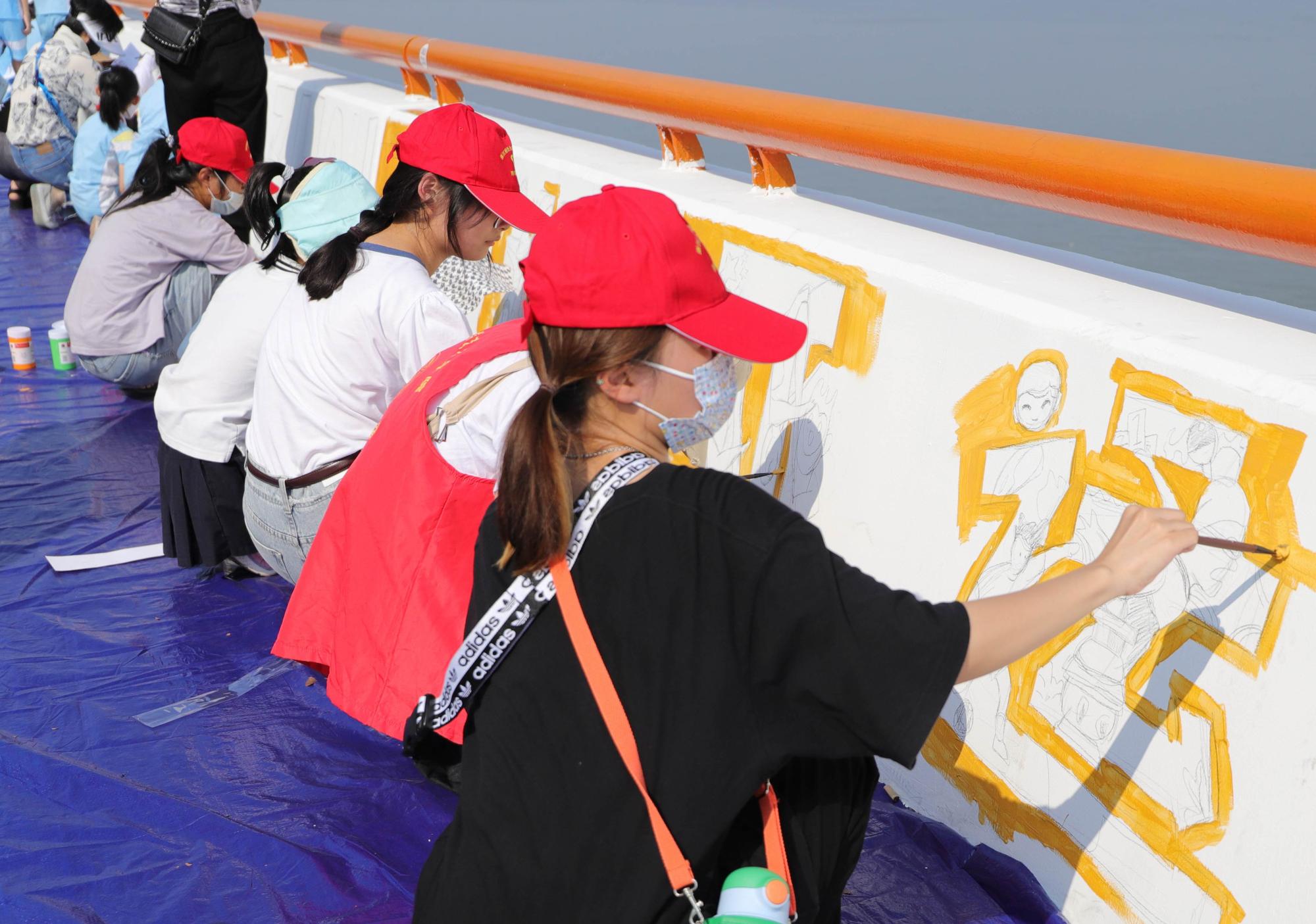 自七甲闸向西500米,复兴大桥向东1522米,学院志愿者们早早来到这个两段合计2022米的钱塘堤岸,明确了负责的区域,每块墙对应一幅画,快速地进入了绘画状态。上午9时左右,小朋友们跟着老师和家长陆续来到场地,在志愿者的带领下,百余支画笔挥毫泼墨,一幅幅画卷出现在钱塘堤岸,增添了一抹别样的风景。