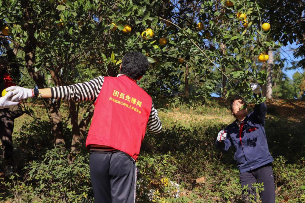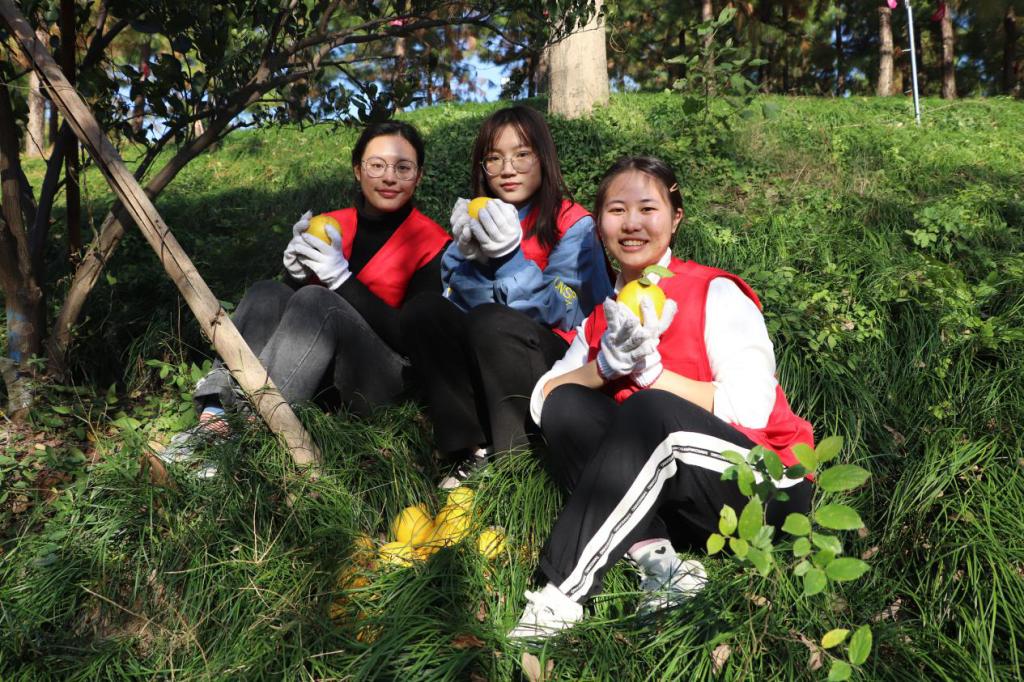 活动现场,师生们三人一组展开作业,大家分工明确、通力配合,摘、拧、剪招式频出,采摘、装筐、运输环环相扣,不多时便收获了一筐筐金灿灿的胡柚。