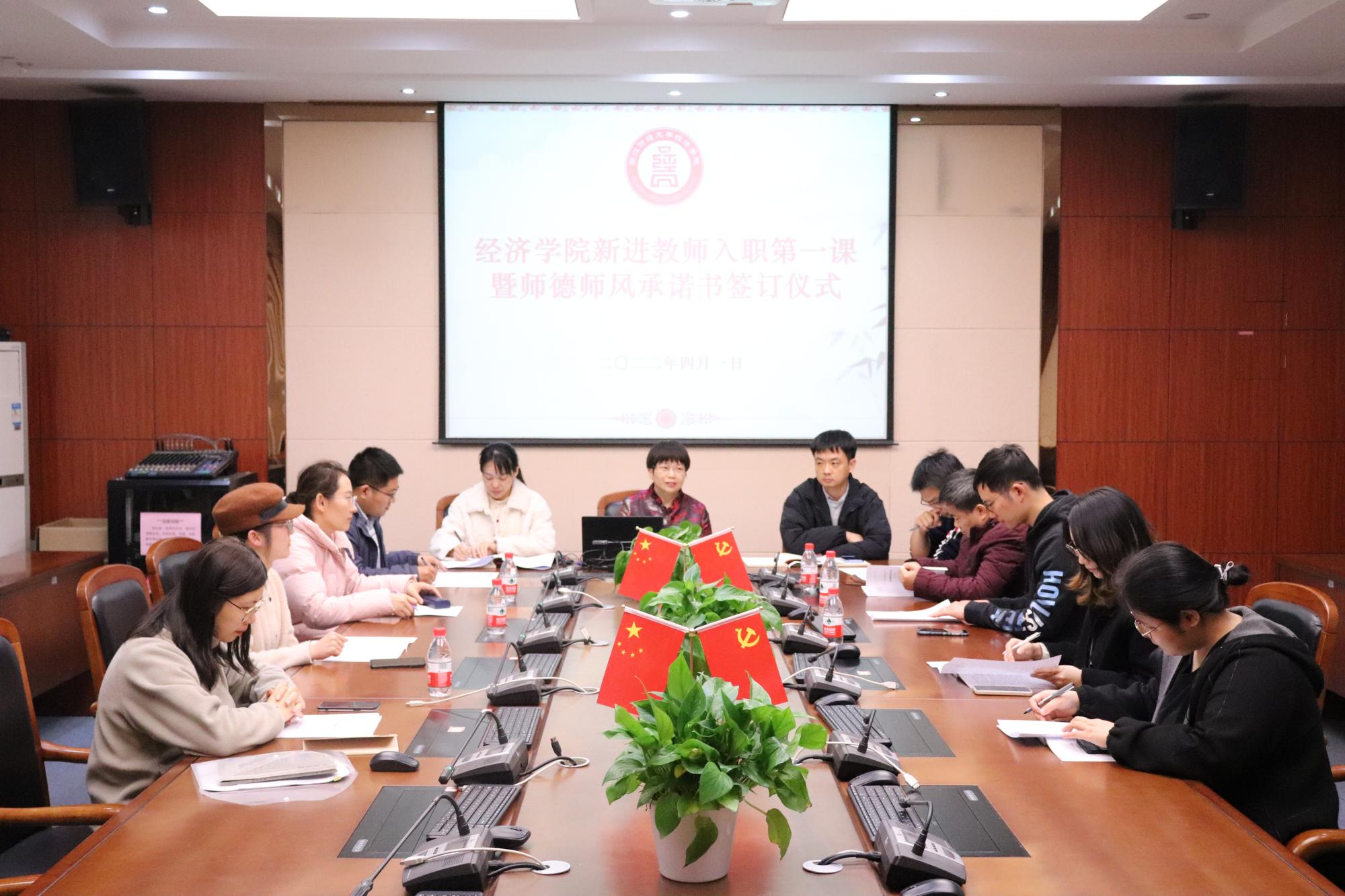 本网讯为切实加强师德师风建设,帮助新入职教师尽快转变角色,近日,经济学院举办新进教师“入职第一课”暨师德师风承诺书签订仪式。学院领导和2022年新进教师参加会议。