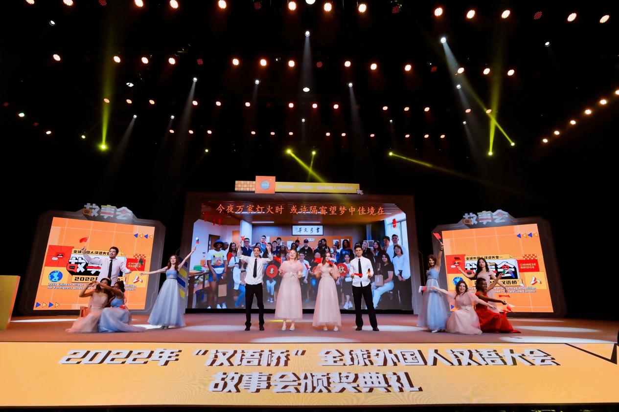 颁奖典礼现场,我校留学生用多国语言带来歌曲联唱《栀子花开》《这世界那么多人》《相亲相爱》,从青涩的校园风情唱到世界人民相亲相爱,很好地贴切了故事会颁奖典礼主题。