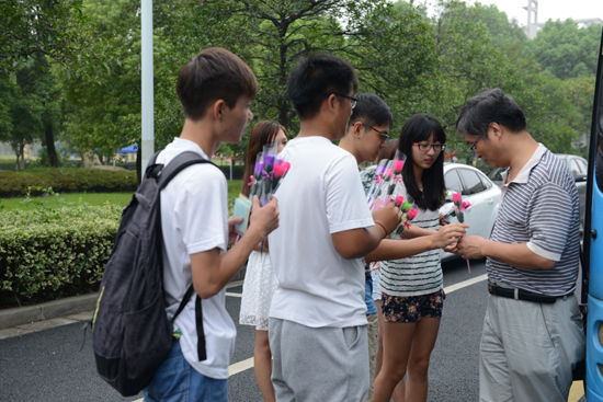 上午7时许,教师们乘坐校车先后抵校,在这样一个开学上课第一天恰逢温暖教师节的特殊日子里,老师们的脸上洋溢着欢欣。校学生会同学向每位经过的老师都献上了写满祝福的贺卡和寄托感恩的康乃馨,温馨诚挚的节日祝福与谢师短句让老师们切身感受到了同学们深深的情谊。此外,校学生会还在西校门开展“我出鲜花,你送恩情”系列活动,向经过的同学们发放花束,邀请他们转赠给自己敬爱的老师们,同学们欣然接受邀请,教师节温馨快乐的氛围弥漫了整个校园。