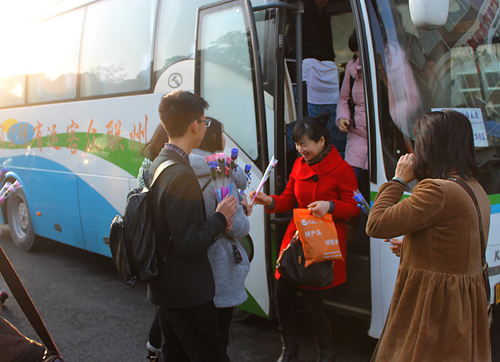 晨曦微露的清晨,教师们乘着校车准时抵达了财大的南门。校学生会同学热情地迎着下车的女教师们,借着手中的鲜花向她们表达节日的祝福,并衷心地说一句:“老师,节日快乐!”热情洋溢的祝福,代表着全校学生对老师真诚的感恩。