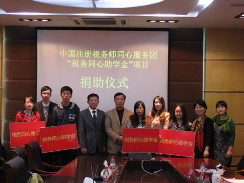 据了解,中国注册税务师协会同心服务团是经中央统战部同意,国家税务总局批准,于今年8月份成立的注册税务师行业的公益性组织,其宗旨是抓好“同心”教育,突出“同心”实践,注重“同心”实效,促进行业健康发展。“税务同心助学金”是由中汇(浙江)税务师事务所有限公司和我校财政与公共管理共同合作,并由中汇(浙江)税务师事务所有限公司出资捐助的一项社会公益项目,该项助学金将资助我校税收学专业3名本科生和1名研究生在校期间的学生生活费用,每人每年资助3000元。