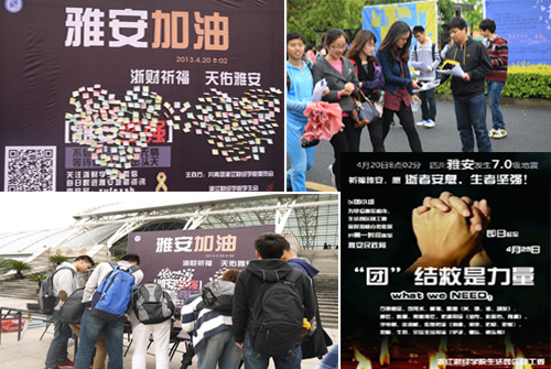 4月20日四川雅安芦山县发生7.0级地震,造成较大的人员伤亡和财产损失,给当地群众生产生活带来极大影响。地震的消息受到全国上下的高度关注,也牵动着浙财学子的心,全校团员青年迅速行动,为雅安受灾民众祈福。