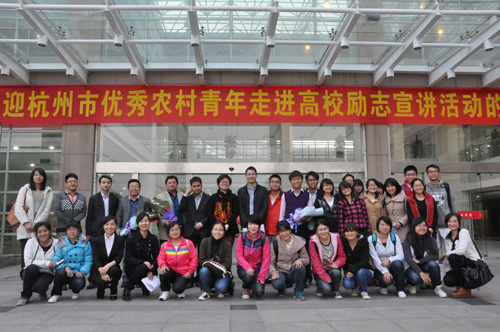 11月13日下午,由共青团杭州市委、杭州市农村青年兴业带头人协会、杭州大学生村官创业俱乐部主办,经济技术开发区团工委、浙江财经学院团委承办的“团旗飞扬、励志青春、青年兴业、共享共赢”杭州市优秀农村青年走进高校励志宣讲活动在浙江财经学院学术二号报告厅隆重举行。共青团杭州市委、校团委负责人出席了本次活动,包括自强补习班学员在内的近200名同学与四位优秀农村青年讲师面对面。