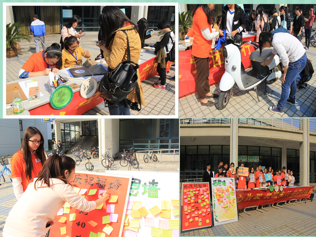 在“艺绘圆盘”板块中,志愿者绘画出各具特色的圆盘,祝福财大,其中有暖阳起于东山,寓意财大如旭日一样蓬勃发展;在“艺起感恩”活动的贴板上,贴满了同学们对财大四十周年校庆的祝福,艺术学院学子以志愿者服务的方式,在生活园区恭祝母校40岁生日。感恩墙上贴满了同学们对母校感恩话语,暖心的感恩卡片承载着同学们的真心,传递着积极的正能量。