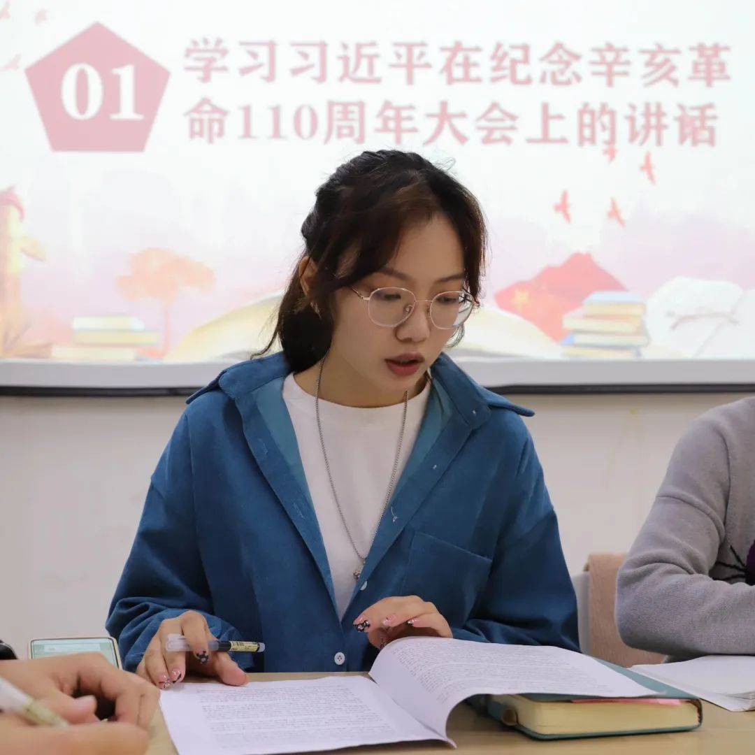 首先,学生会执行主席郑雯雨带领全体成员重温了习近平在纪念辛亥革命110周年大会上的讲话。她号召全体成员弘扬爱国主义精神,树立民族自信心,结合艺院特色,发扬孙中山先生等辛亥革命先驱的伟大精神,携手向着中华民族伟大复兴的目标继续奋勇前进!