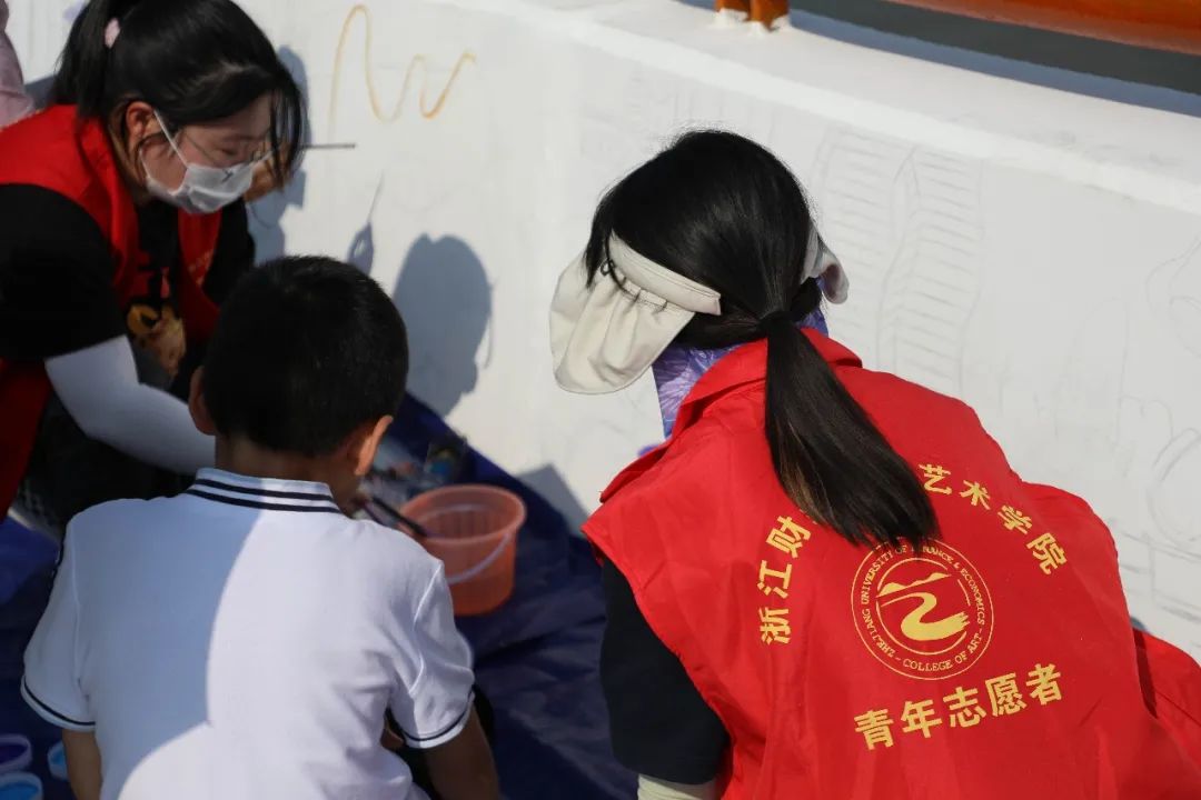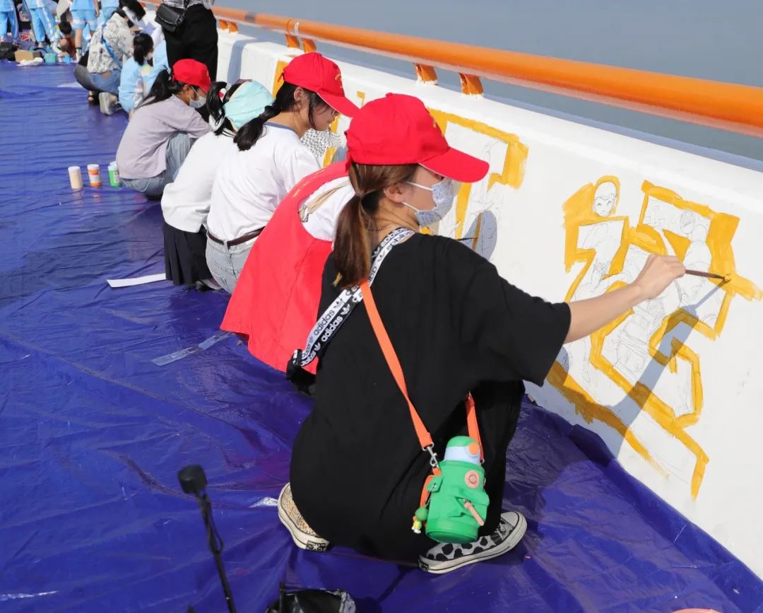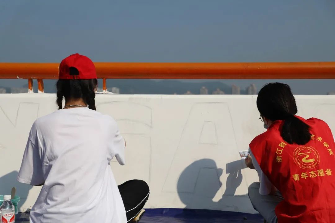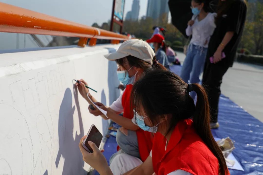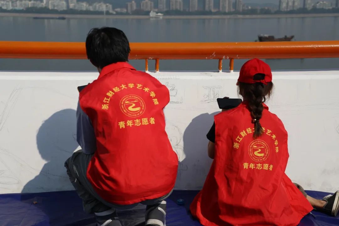 自七甲闸向西500米,自复兴大桥向东1522米,我院志愿者们早早来到这个两段合计2022米的钱塘堤岸。穿上红马甲,我们是艺术学院的志愿者;走出校门,我们是ued体育 的志愿者;来到江畔,我们是社会的志愿者。找到现场的工作人员,明确了负责的区域,编号85-编号101,共十七块区域,志愿者们按照提前安排好的名单,2-3人一组负责一块墙面,每块墙对应一幅画,快速地进入了绘画状态。
