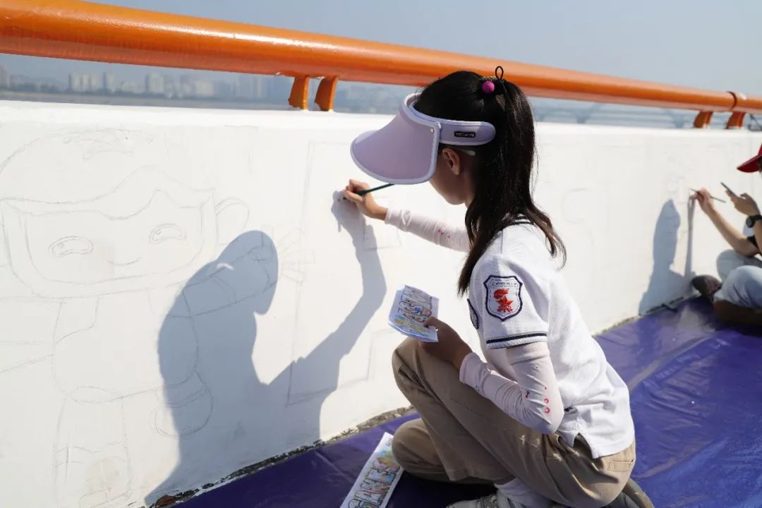 九点左右,小朋友们跟着老师还有爸爸妈妈陆陆续续来到场地,长长的江畔,一下子热闹了起来。小朋友们兴致勃勃,在志愿者的带领下,百余支画笔挥毫泼墨,一幅幅画卷出现在钱塘堤岸,增添了一抹别样的风景。