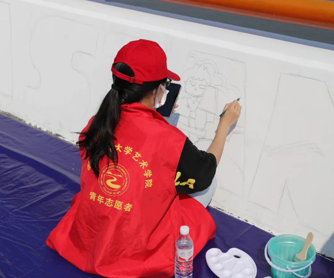正午,正是阳光高照的时候,汗水已浸蚀志愿者们的脸颊,但并没有让他们停下双手,而是更加有劲一鼓作气想把它画完。