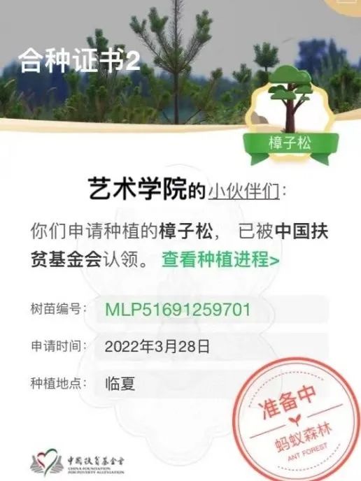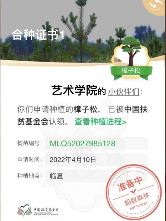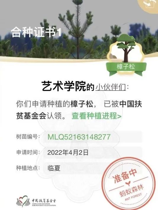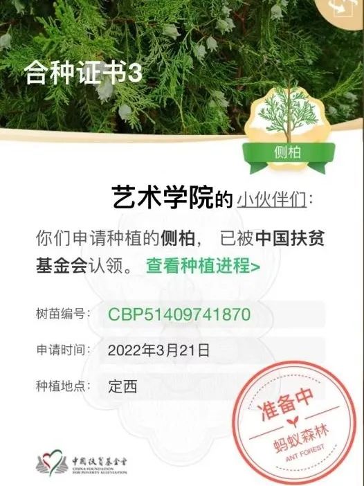 活动期间艺术学院学子通过每日在“蚂蚁森林”坚持不懈的浇水,借“蚂蚁森林”平台在中国临夏、定西共申请种植7棵树,并均已被中国扶贫基金会成功认领。不久后,树苗们将带着艺术学院学子的满心期许和展望,在神州大陆上蓬勃生长!