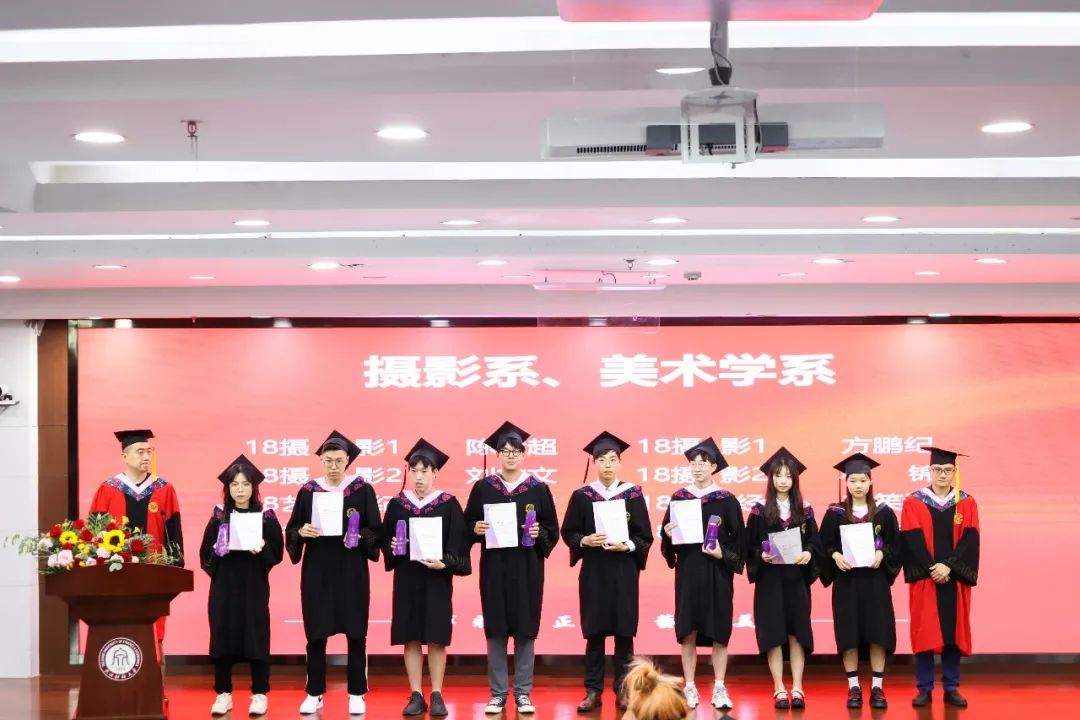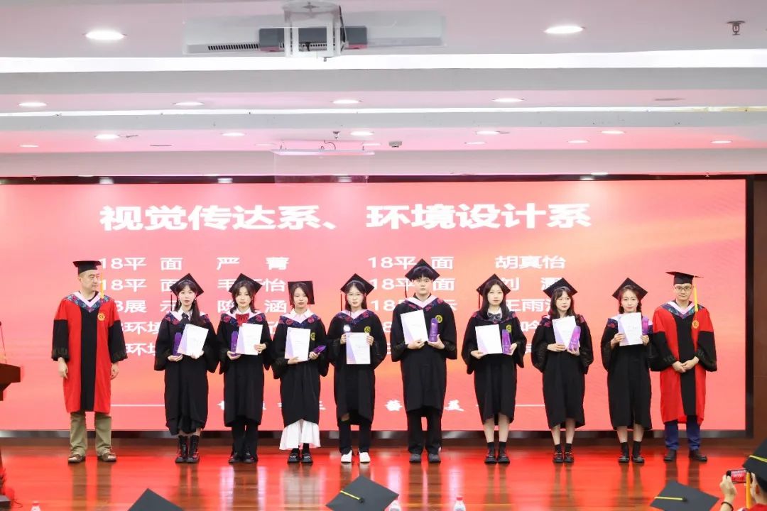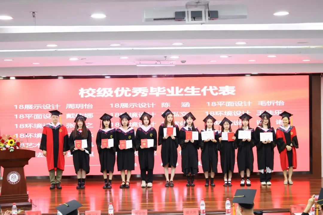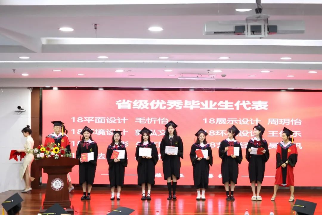 在众多学生中总是有一群更加优秀的同学们。领导们逐一上台为省级、校级优秀毕业生以及毕业展览最佳创作奖获得者进行了表彰,肯定了他们在校期间的综合表现、专业素养与学习态度等,获奖同学们也深受鼓舞,将再接再厉,不断精进。