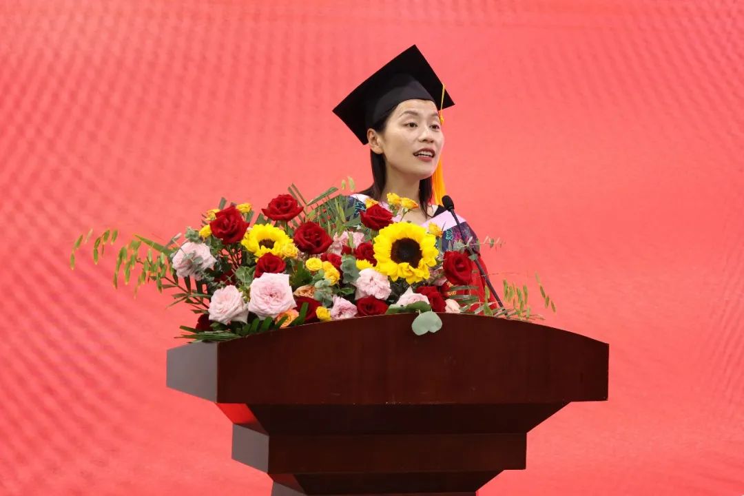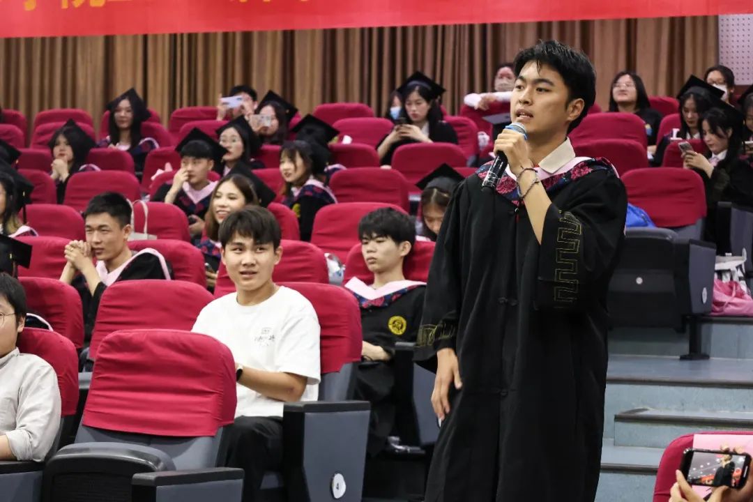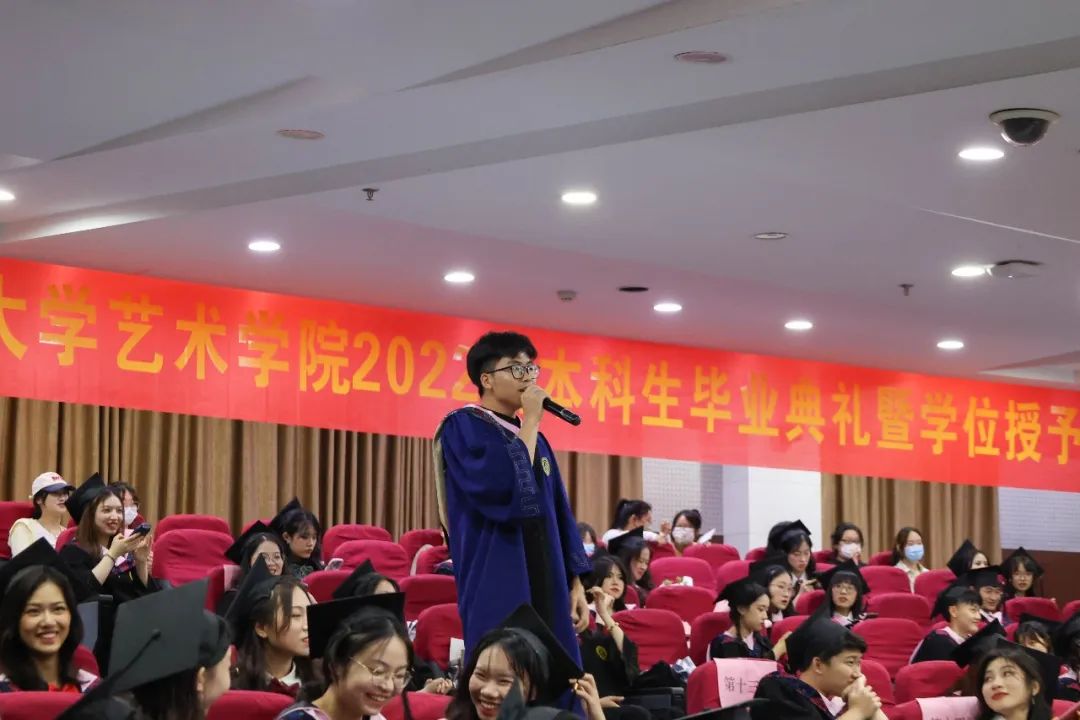 18艺术经纪毕业生吴依帆同学作为毕业生代表发言。她先和大家分享了大学四年的收获,同时也共勉大家始终不忘初心,永远不要只着眼于前方路途的遥远,要始终记得一路以来的坚持;希望所有人有一份热,发一分光,拒绝躺平,做奋发向上的艺术浪花!最后,她向母校、向一直以来支持鼓励他们的老师和同学们表示衷心的感谢,也愿母校、每一位老师、同学万事胜意。