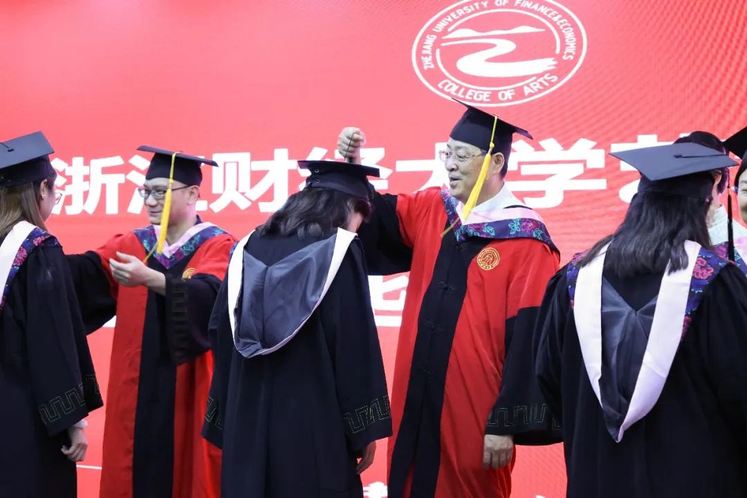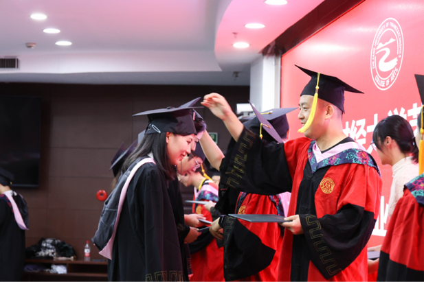 “扶苏拨穗、定格美好”。导师们身着导师服站成一排与毕业生们深情的握手拥抱、颁发学位证书,并将他们的学士帽右侧的流苏拨至帽左。学院用这种庄重的仪式感,为毕业学子们人生的一个重要阶段画上圆满句号。