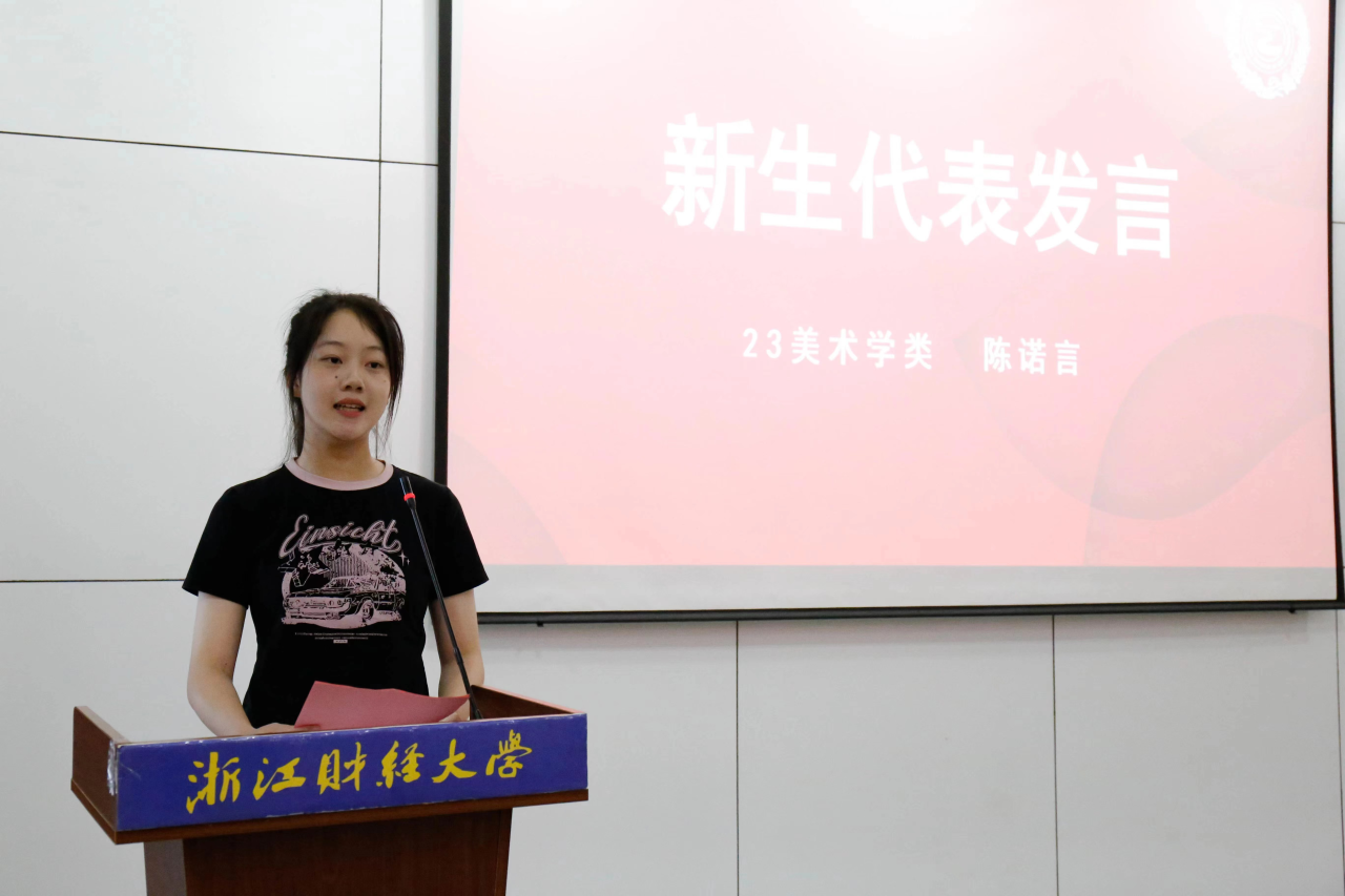 经过13天的军训,相信各位新生们已经初步适应了财大人、艺术人的这个身份,在这个过程中也已经开始思考自己的大学生活该如何度过才更加有意义。陈诺言同学作为23级新生代表发表讲话,她很高兴与和各位同学相识于浙财,共同度过未来的四载春秋。我们从不同地区而来,因为一个共同的选择而相遇,相信未来的光明之路会在我们脚下徐徐铺展。山河虽无恙,吾辈当自强。愿我们在座的每一个人都能立足华夏土壤,通达四方学问,做一名堂堂正正的浙财学子。也祝同学们在大学里,都能找到自己热爱的事物,关关难过关关过,前路漫漫亦灿灿!