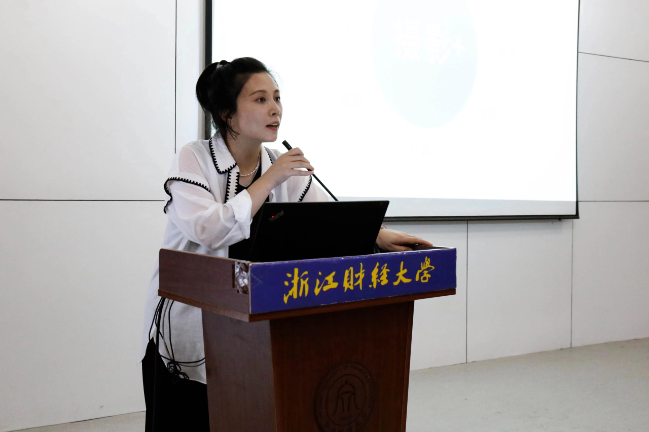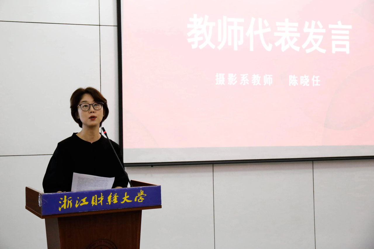 摄影系教师陈晓任作为教师代表发言。她为200名新生在人生重要的路口来到浙财艺术学院感到由衷的高兴。在未来的四年内,她希望大家可以以兴趣引航专业,一步一个脚印,在专业思辨中探索无限可能,在全力以赴中探索未来方向。不仅是摄影专业的勤拍摄常思考,还要将这种探索世界的可能性,善于发现美好的眼睛运用到生活之中,正式开启自己的主角脚本!