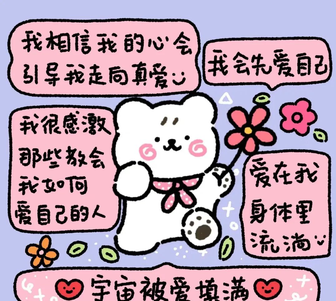 请从最小的事做起,告诉自己,你很棒。如果你在学习新的事物,以前从未尝试过的,请相信我,你会越来越觉得轻松和容易,请为自己努力吧!从现在开始爱自己请不要再拖延,「不满意自己」是一种习惯模式。如果你现在就能爱自己、接纳自己,当有美好的事物出现时,你就会觉得幸福,如果你学会了爱自己,就能爱和接纳别人。