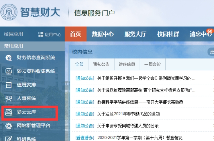 1、登录“信息门户”,点击“应用中心”下的“彩云云库”登录界面