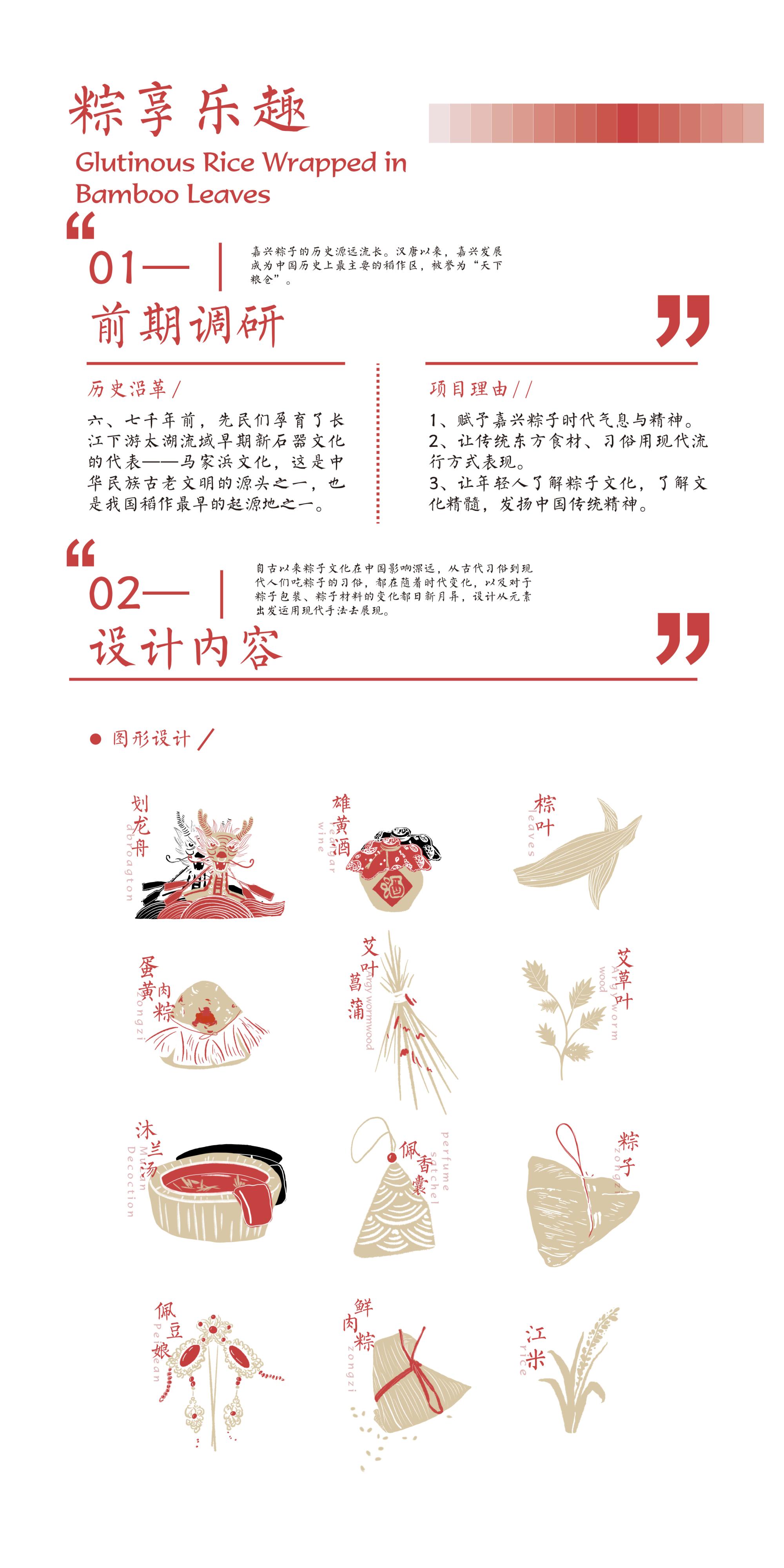 在这个快速发展追求新意的时代,我们的传统文化已经已经渐渐淡出95后视野,不仅是文化、习俗的变化,更是传统文化的没落。作品以嘉兴粽子为出发点,找到与粽子有关的习俗及材料,采用插画形式言简意赅的表达出粽子文化。以传统习俗为主要意象,以现代插画形式为表达方式,以结合传统艺术和现代文化为理念,为“粽享乐趣”品牌设计了包装及周边。