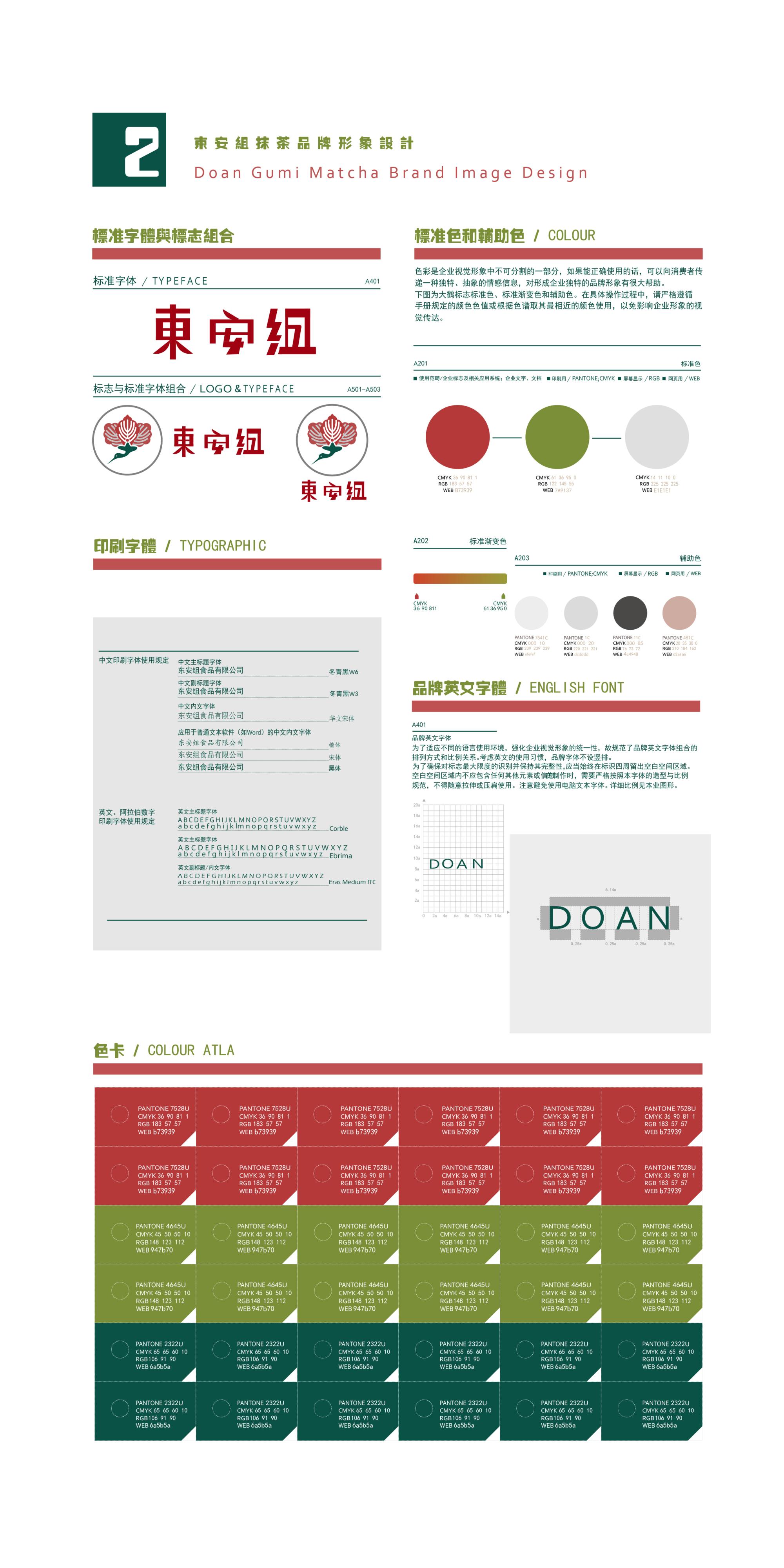 在家乡,东安盛产农副产品,在家乡有特殊意义。特别是茶叶,非常有名。东安茶叶品牌,在家乡人的心中有着很深的烙印。东安二字古朴,取自于宋朝,适合做民国字体设计。设计以“文化符号”和“抹茶”为主题,对富春山居图这一特定元素进行借鉴,在画作中提取改编出更具现代化的文化性视觉语言,应用在抹茶品牌中,颜色以“红白绿”为主。