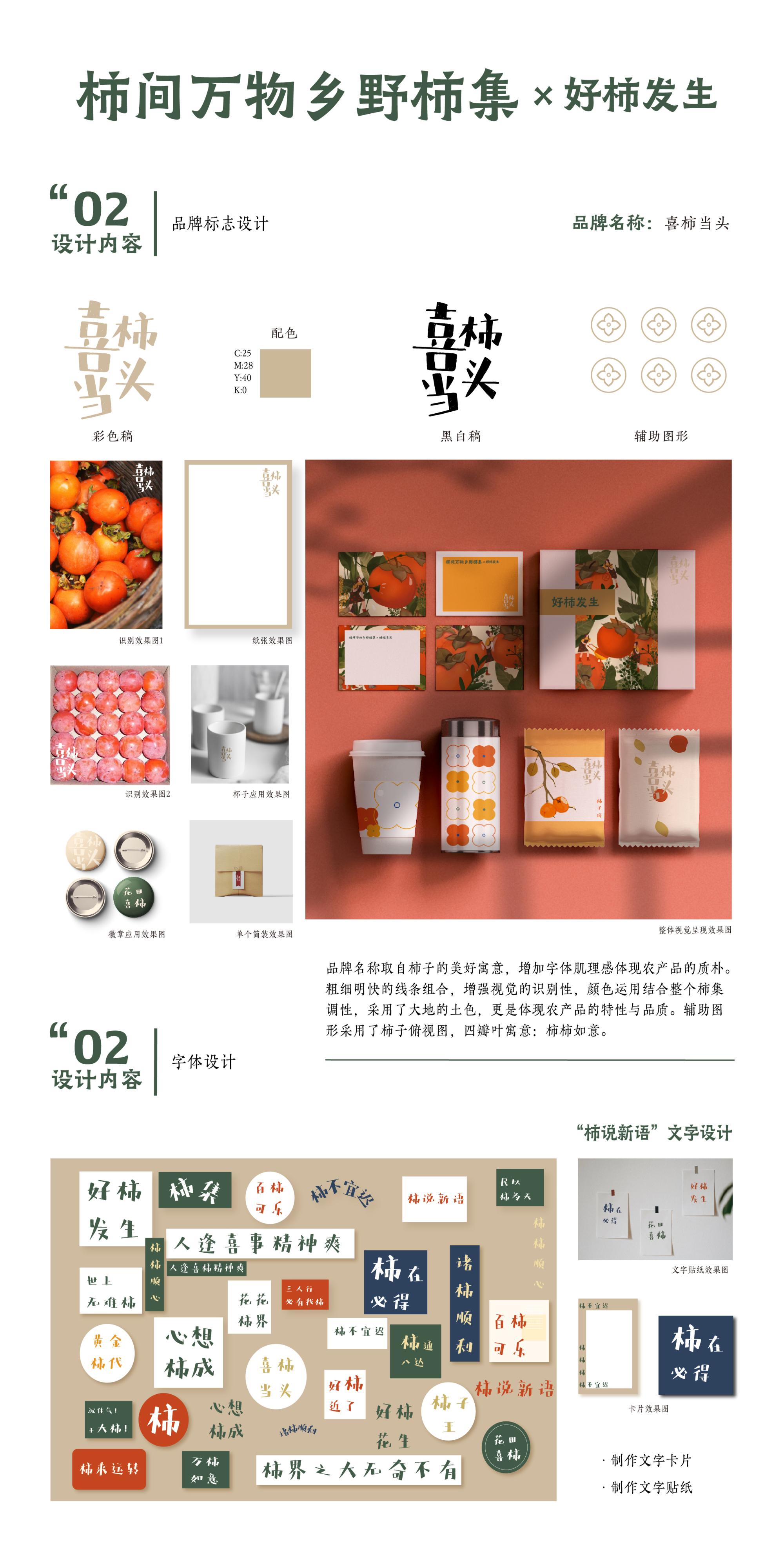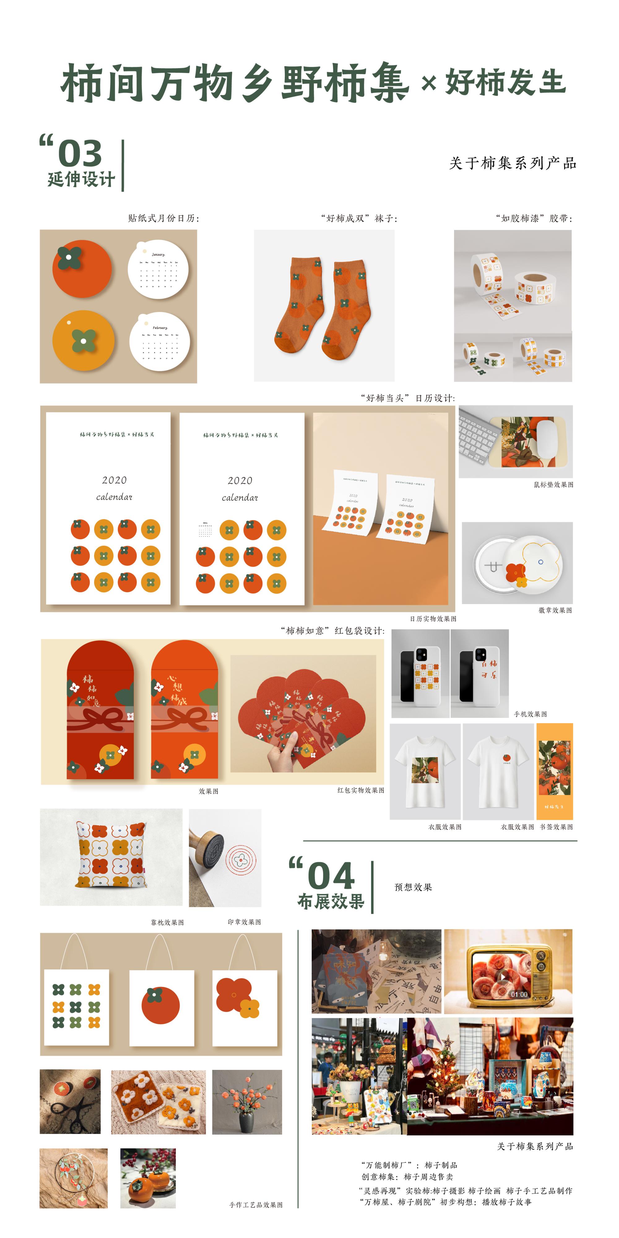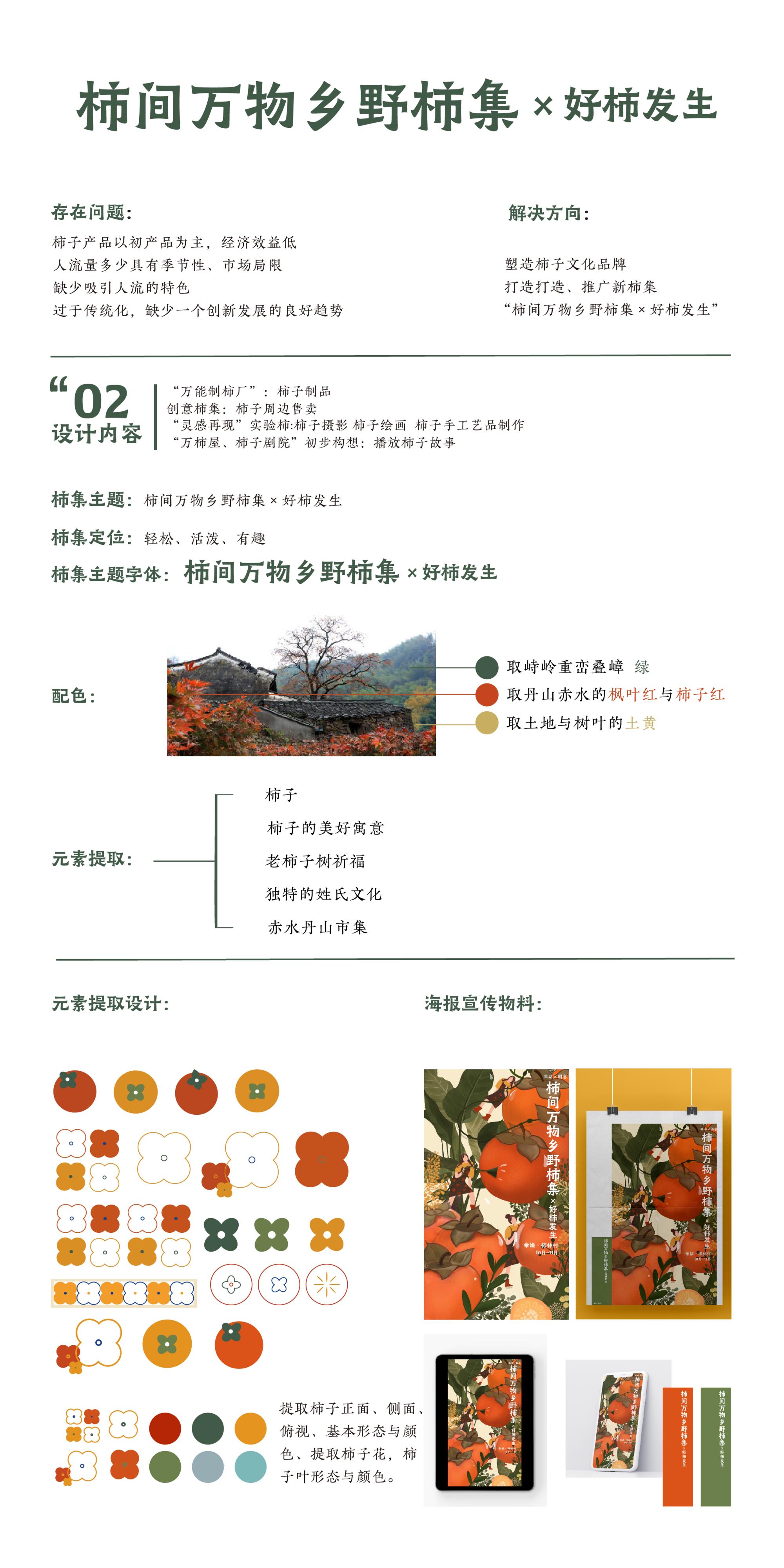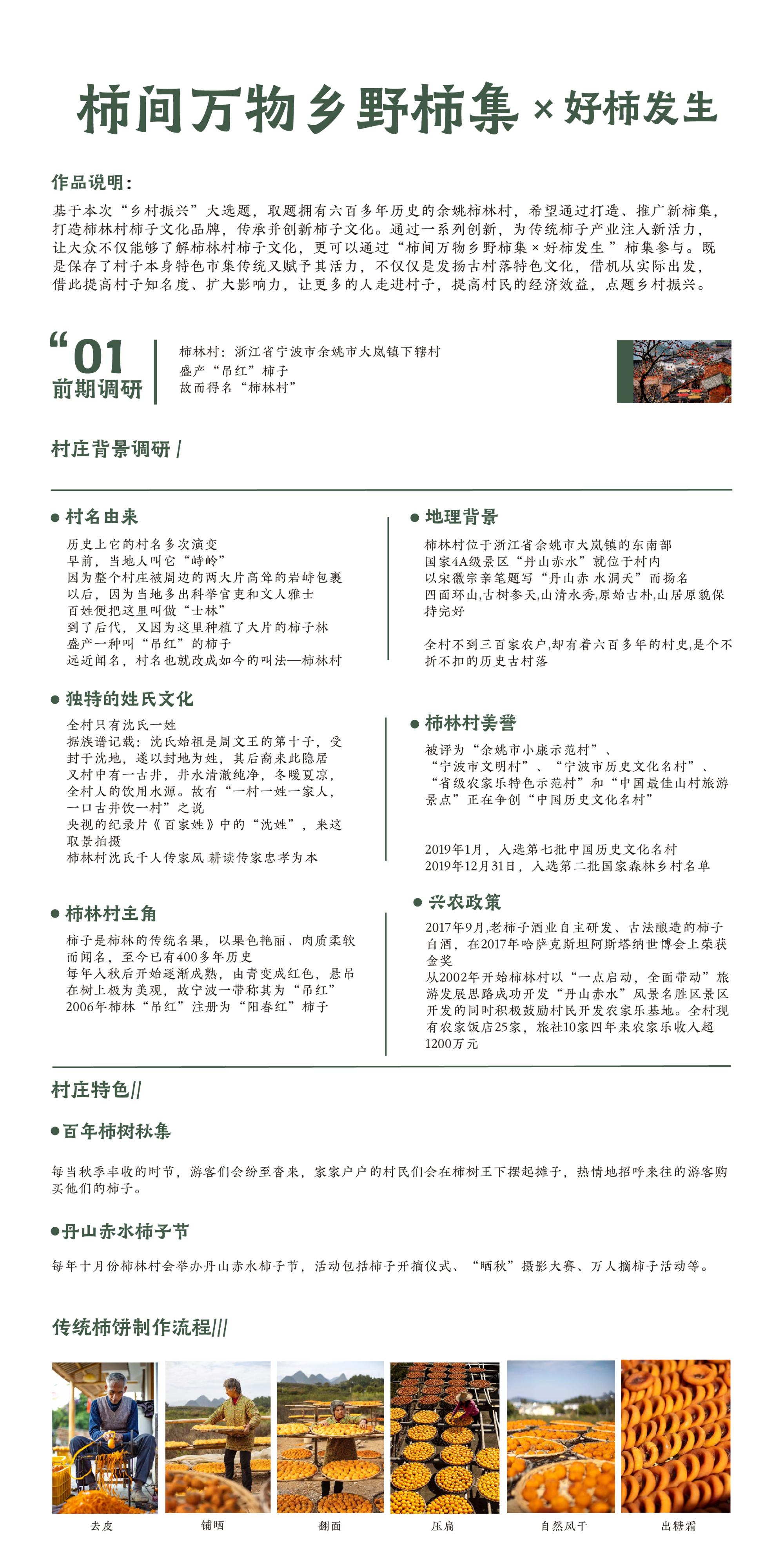 基于本次“乡村振兴”大选题,取题拥有六百多年历史的余姚柿林村,希望通过打造、推广新柿集,打造柿林村柿子文化品牌,传承并创新柿子文化。通过一系列创新,为传统柿子产业注入新活力,让大众不仅能够了解柿林村柿子文化,更可以通过“柿间万物乡野柿集×好柿发生”柿集参与。既是保存了村子本身特色市集传统又赋予其活力,不仅仅是发扬古村落特色文化,借机从实际出发,借此提高村子知名度、扩大影响力,让更多的人走进村子,提高村民的经济效益,点题乡村振兴。