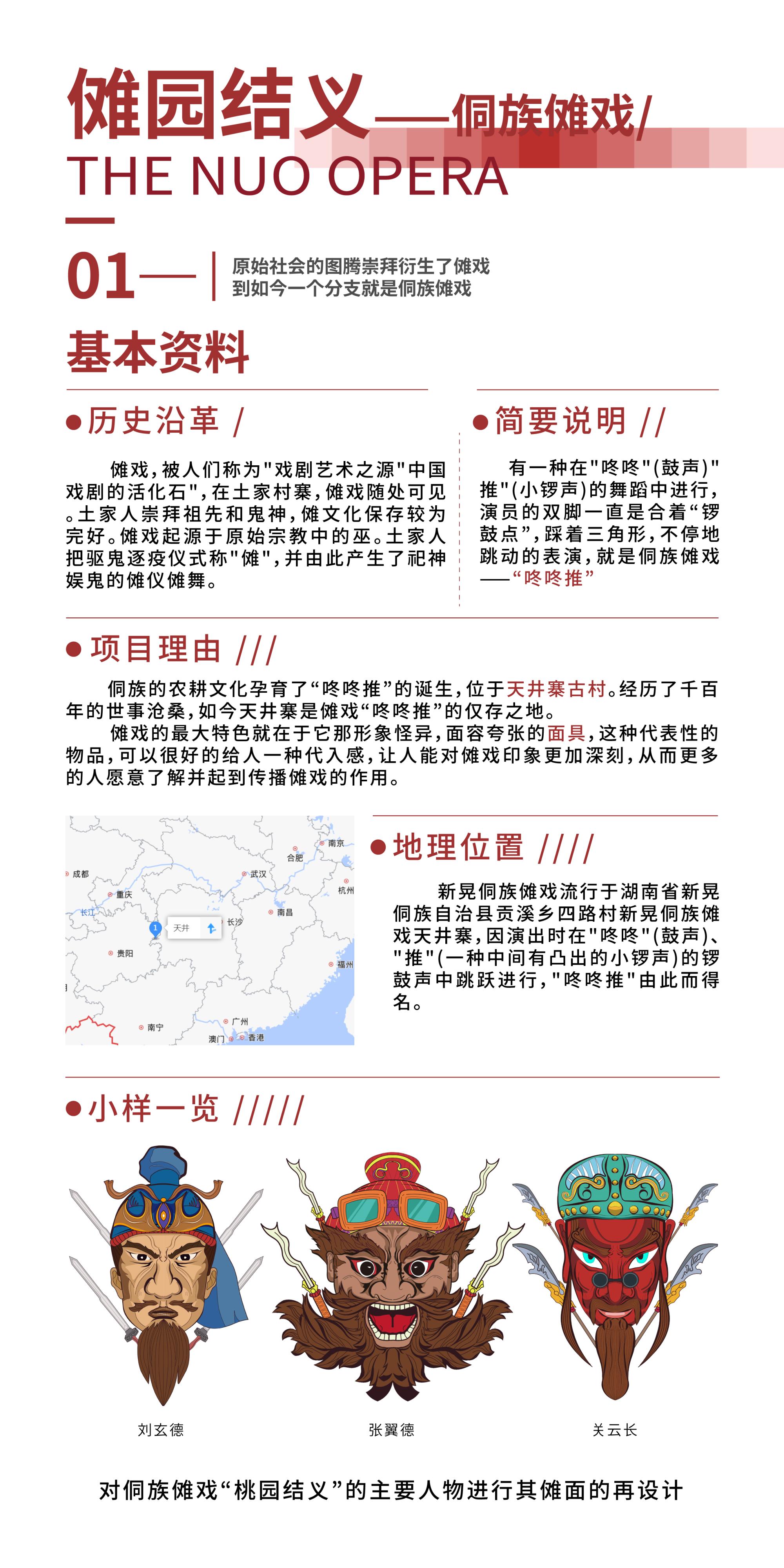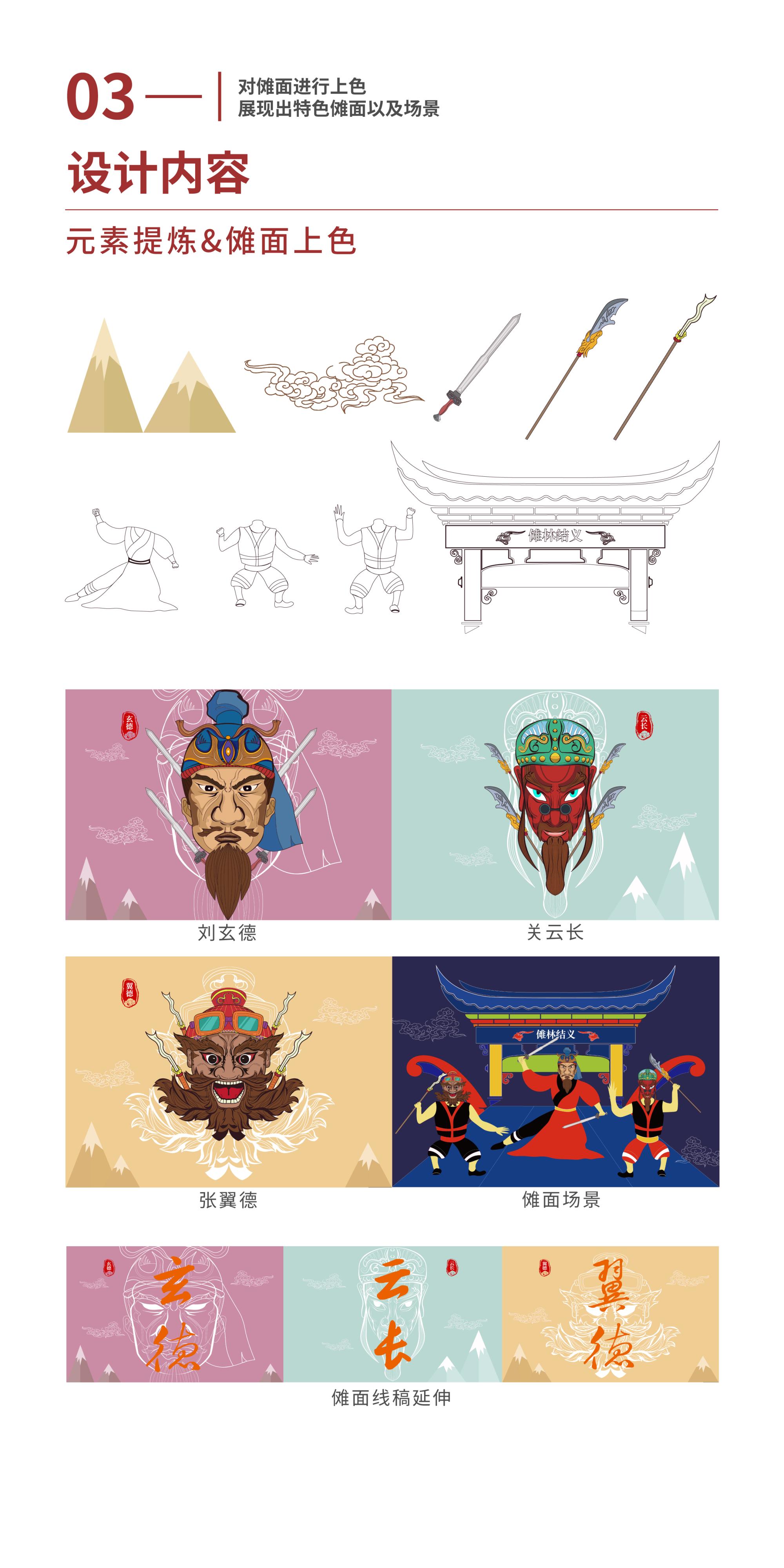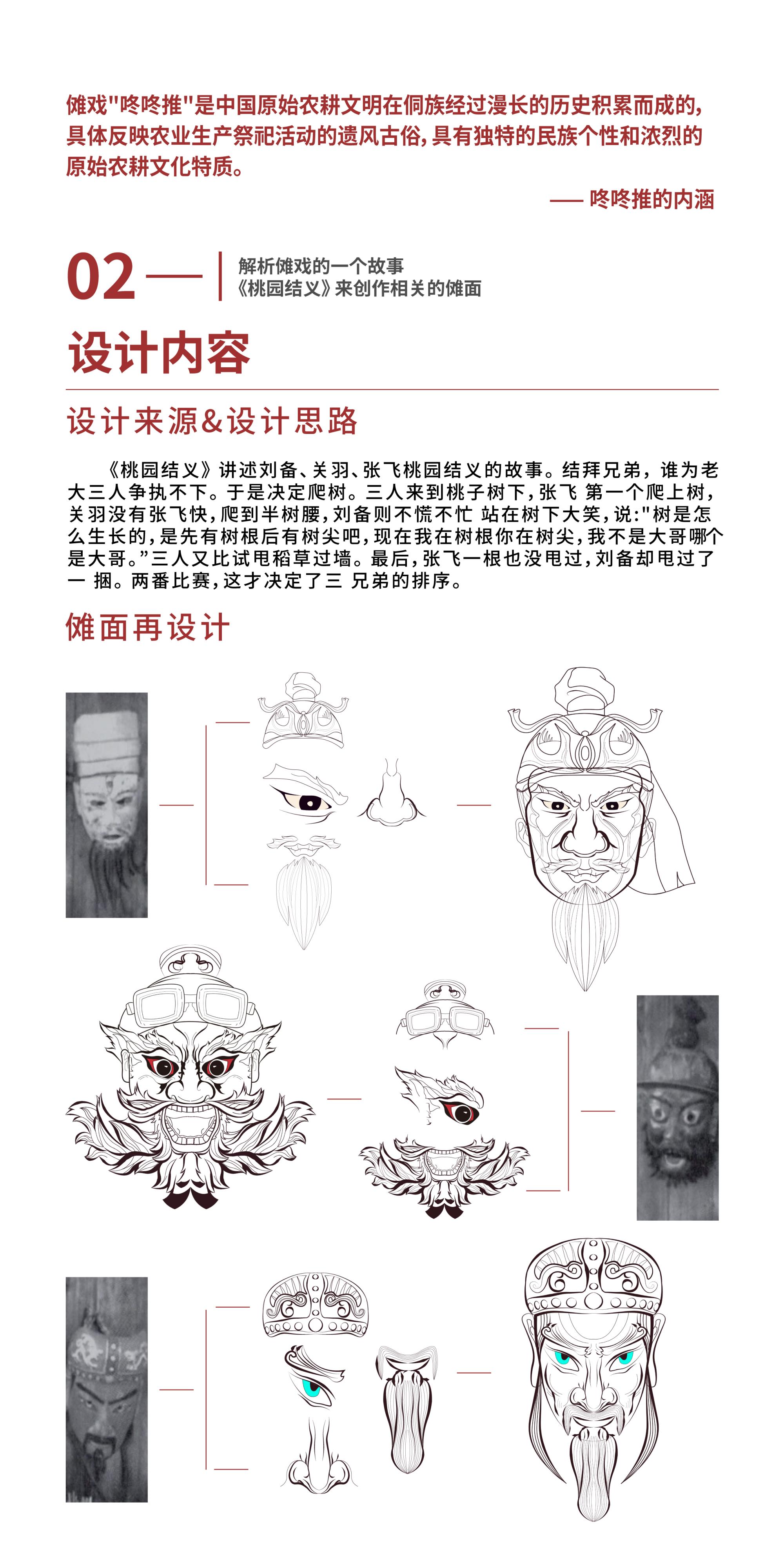 为了使新晃侗族的傩戏“咚咚推”能更好地传承发展下去,避免其消逝在文化的长河中,需要结合现代思维创新表达,将傩戏的灵魂——傩面进行再设计,使之能够更好的被当代年轻人所接受与传播,并创作文化周边,带动乡村经济发展,让越来越多的人了解并起到保护侗族傩戏的作用。