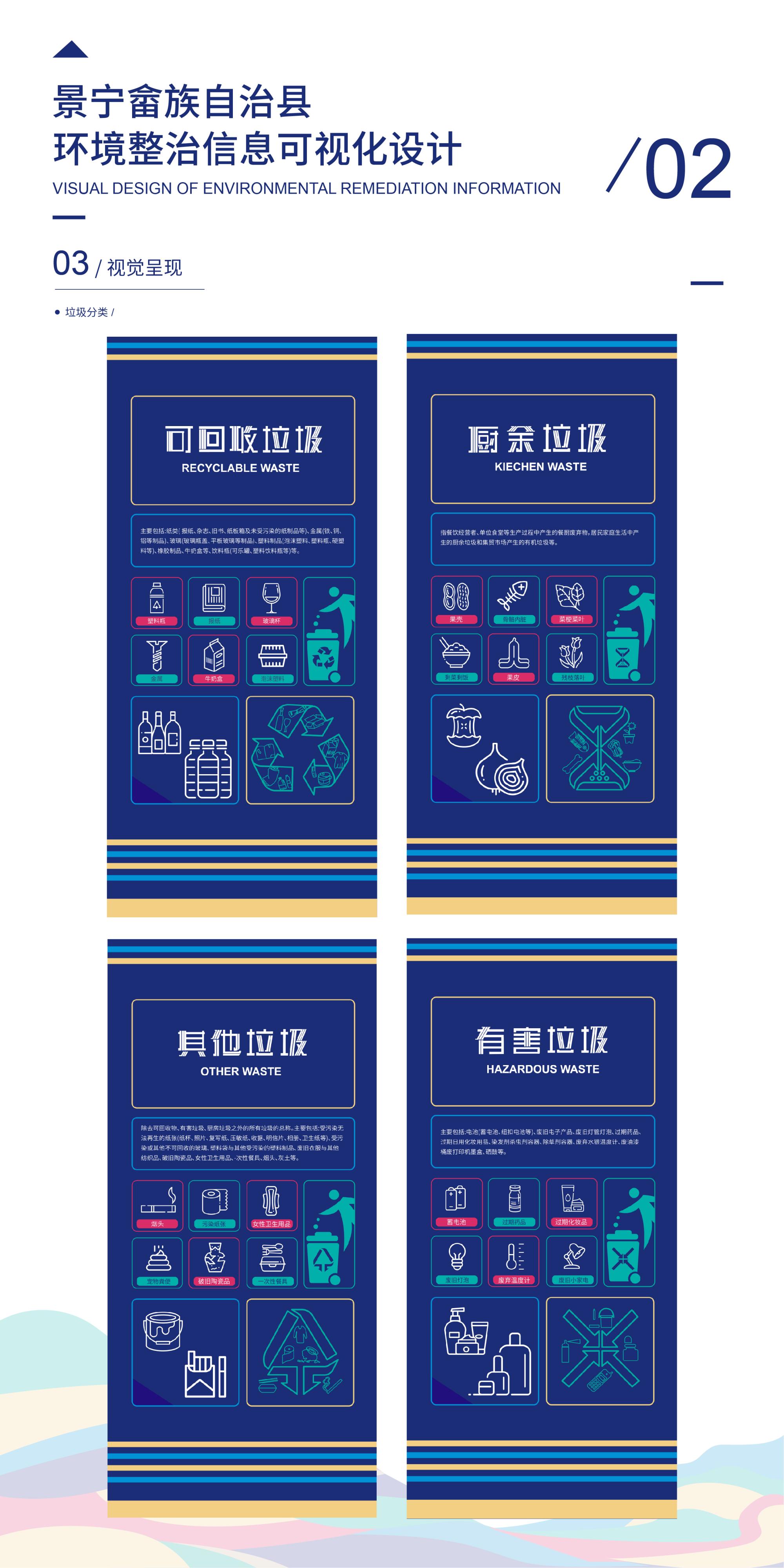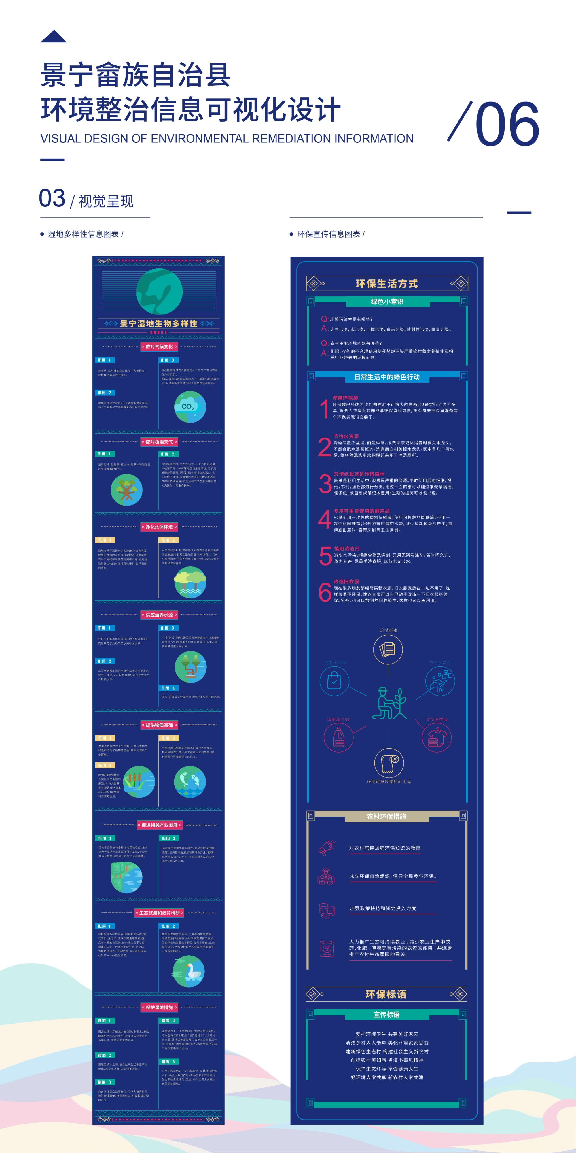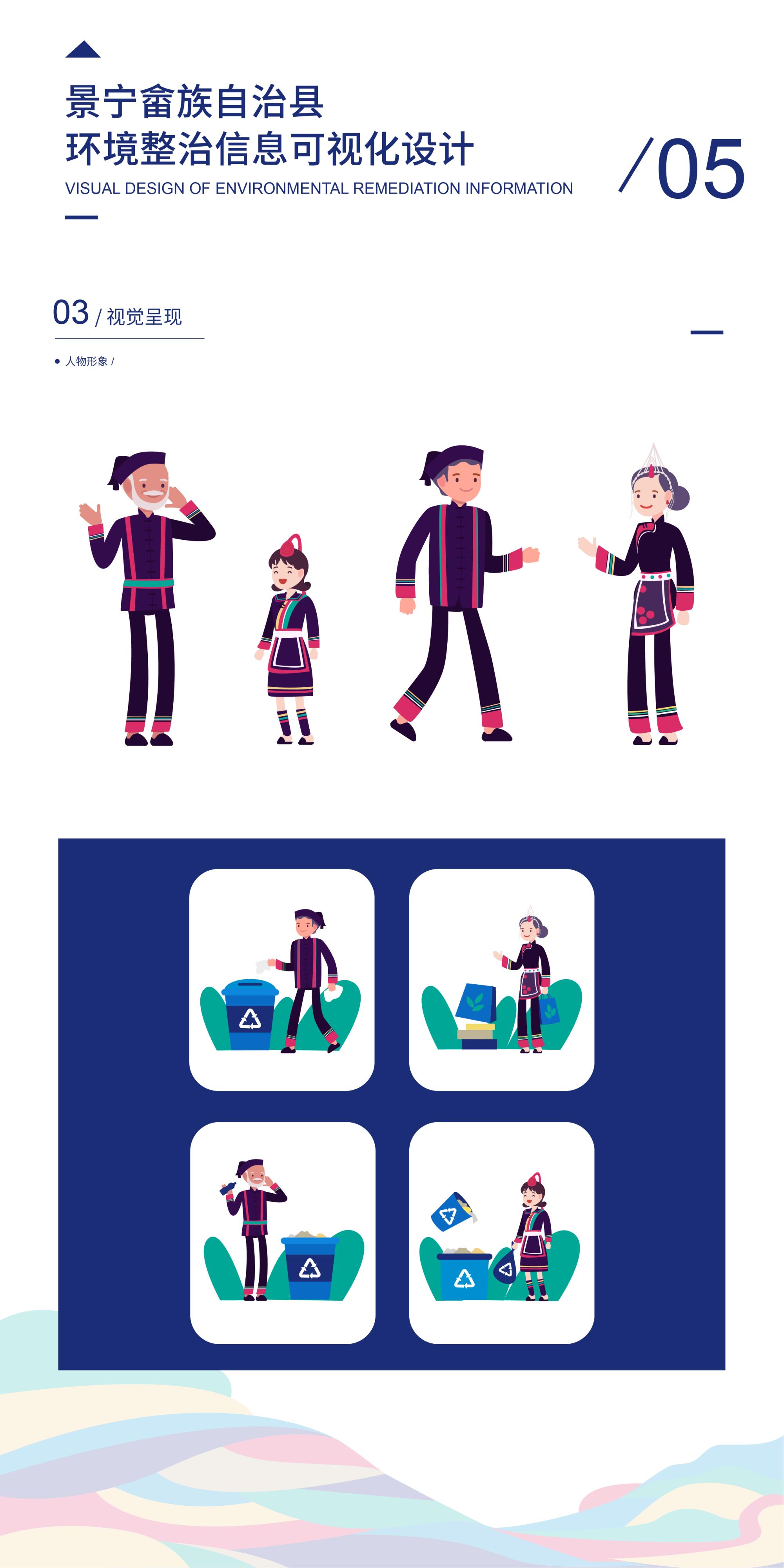 通过分析景宁畲族自治县环境保护的现状、存在的问题、面临的机遇等,结合畲族的风土人情和特点,聚焦推进村容村貌整治,注重赋予文化内涵,提升村庄整体形象。在了解、理解景宁畲族自治县环境问题、社会环境及文化背景基础上,通过对畲族文化的创意解构和视觉再造,提炼出以景宁畲族自治县为代表的畲族文化,助益畲族文化的传承和发展。