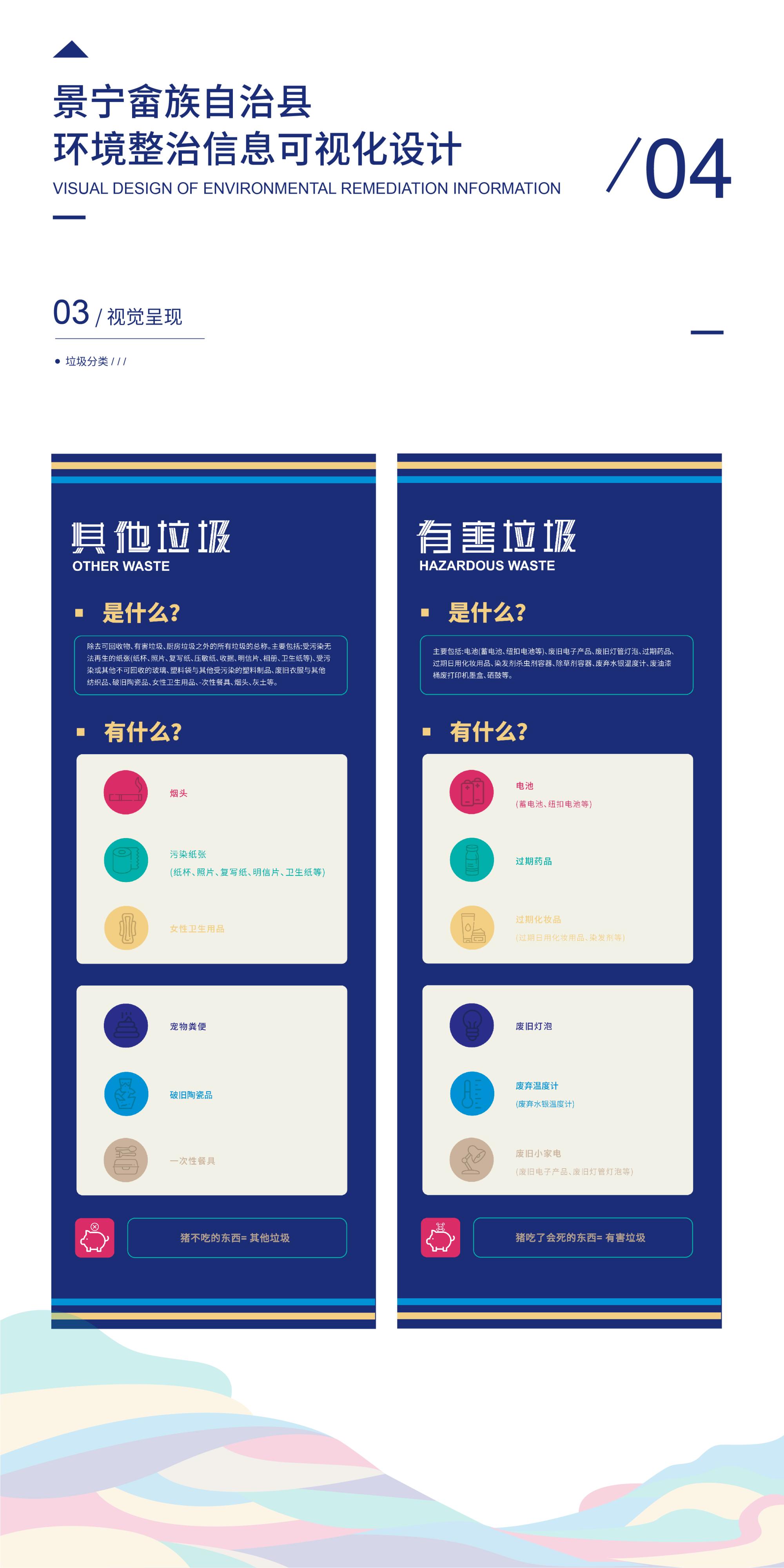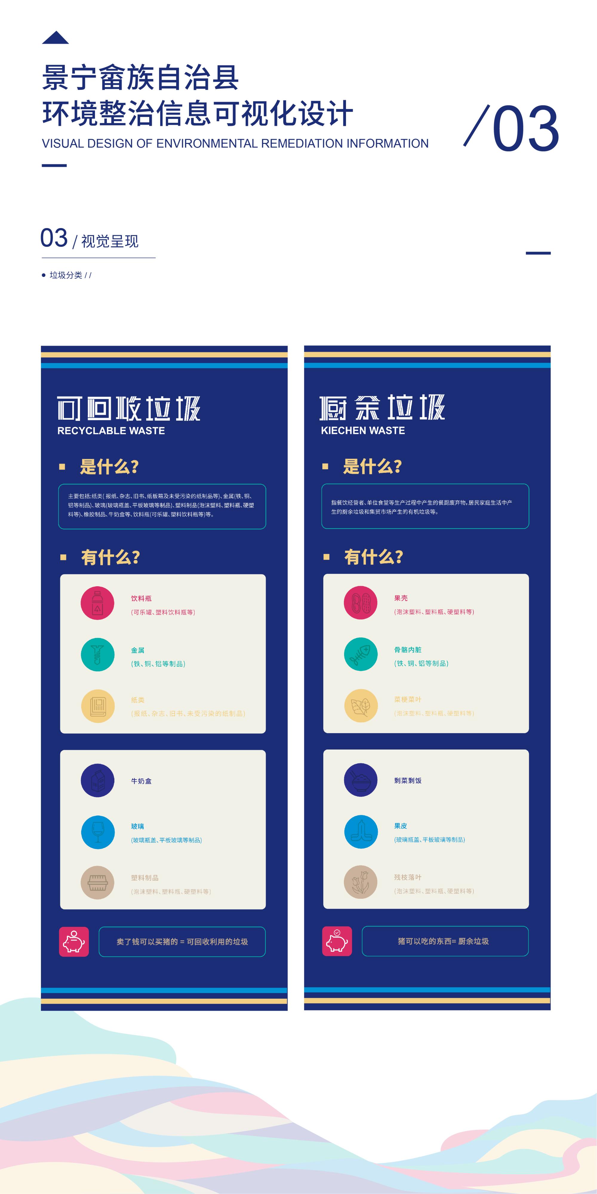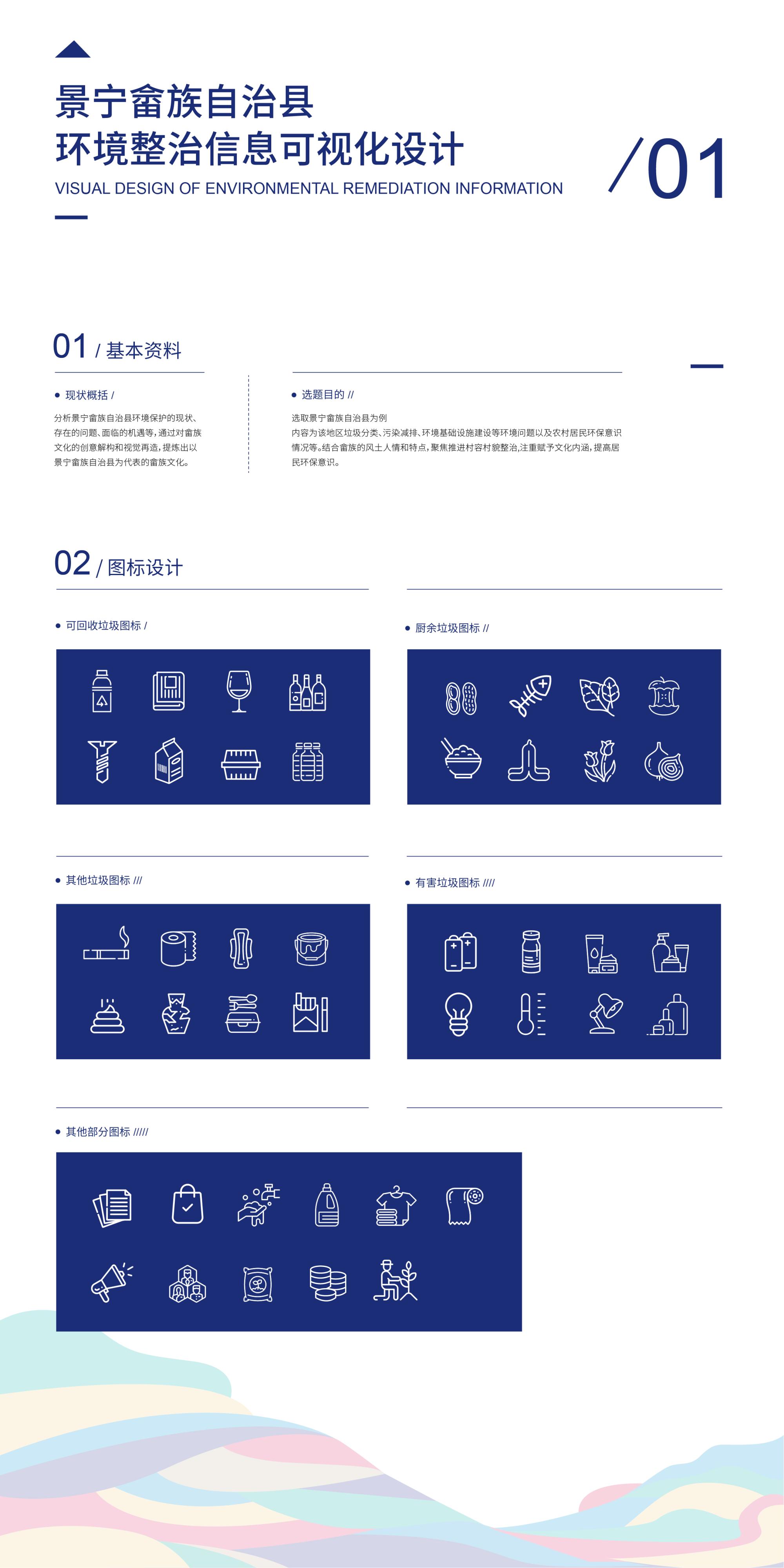 通过分析景宁畲族自治县环境保护的现状、存在的问题、面临的机遇等,结合畲族的风土人情和特点,聚焦推进村容村貌整治,注重赋予文化内涵,提升村庄整体形象。在了解、理解景宁畲族自治县环境问题、社会环境及文化背景基础上,通过对畲族文化的创意解构和视觉再造,提炼出以景宁畲族自治县为代表的畲族文化,助益畲族文化的传承和发展。