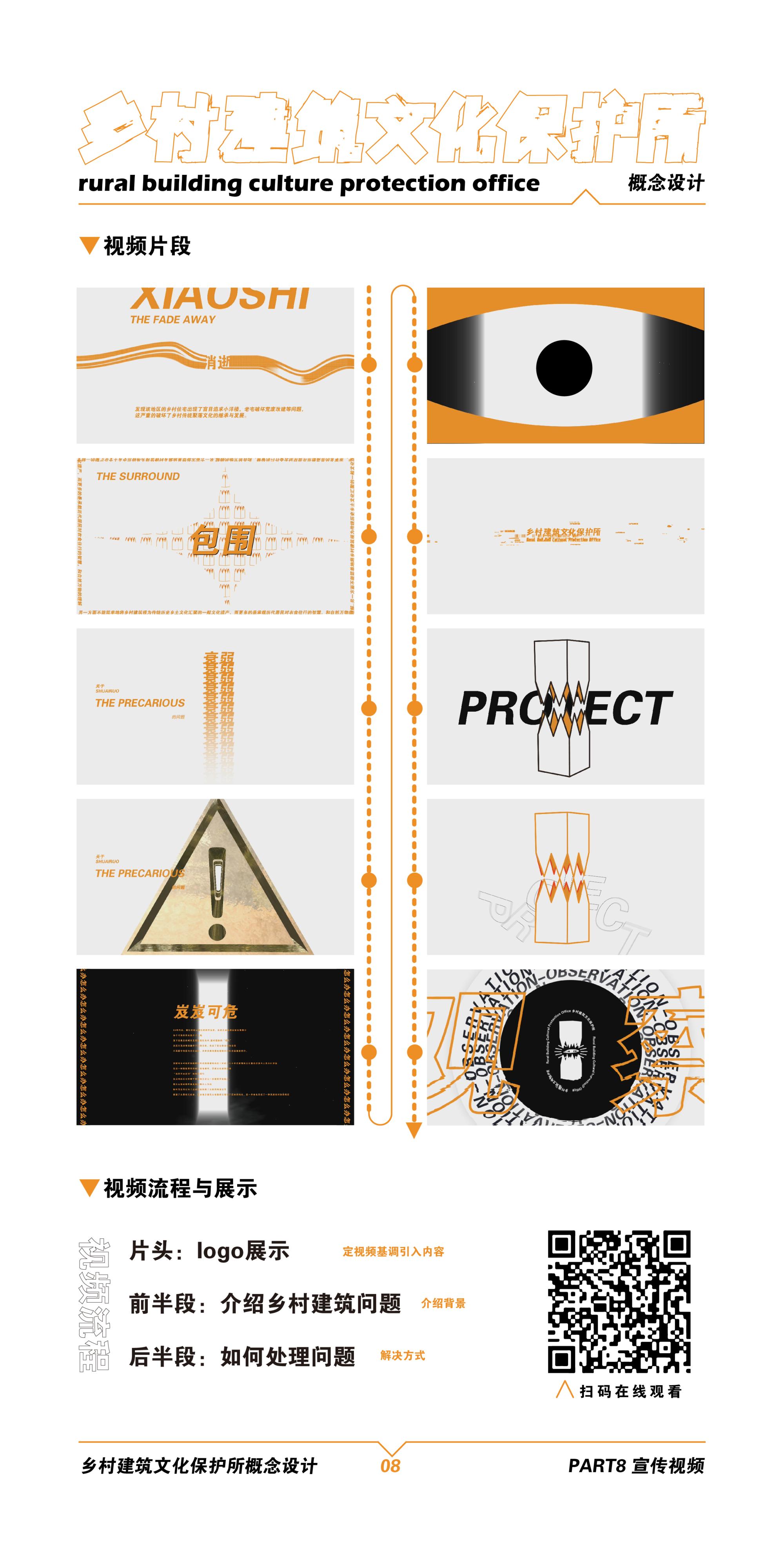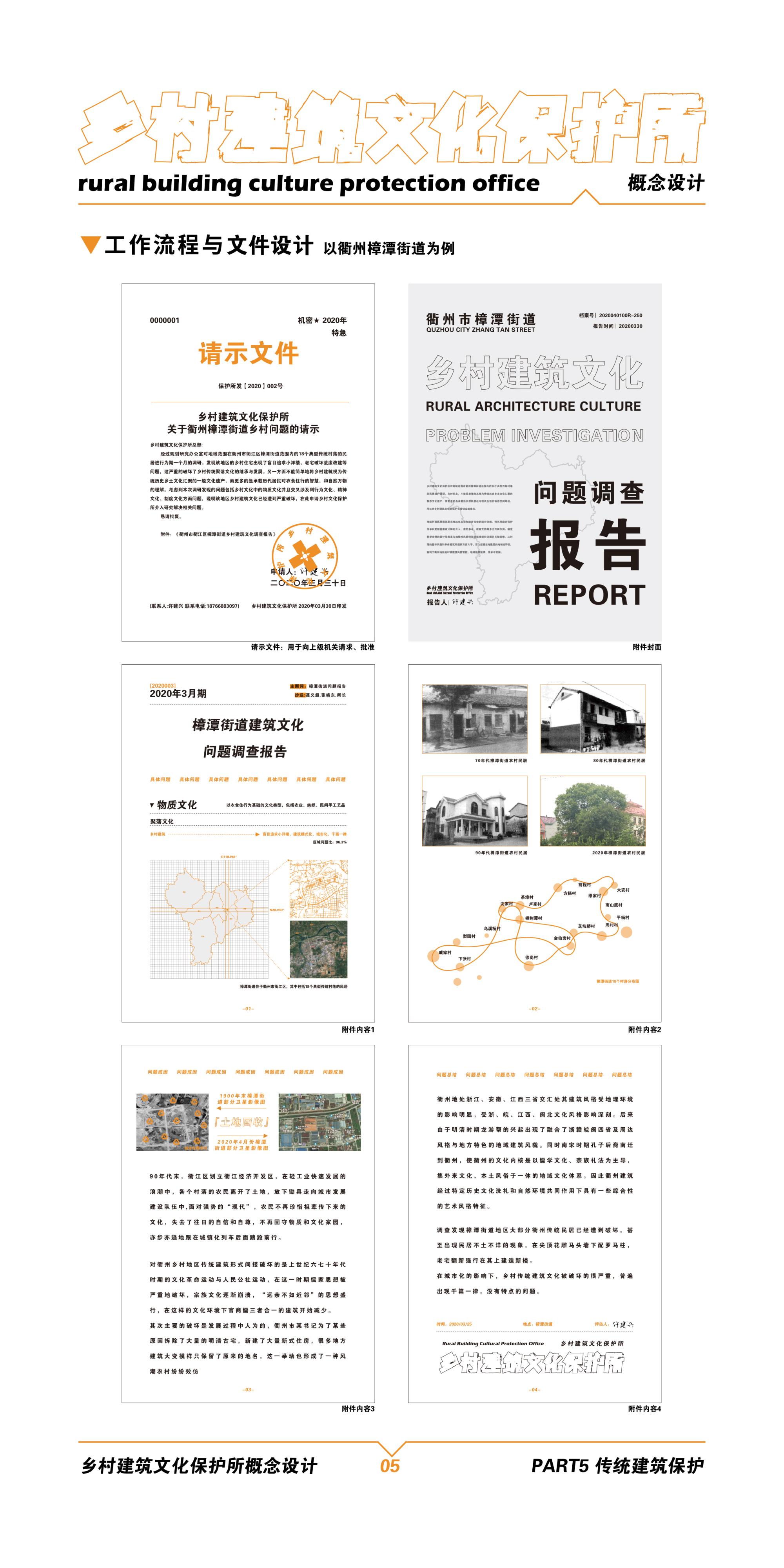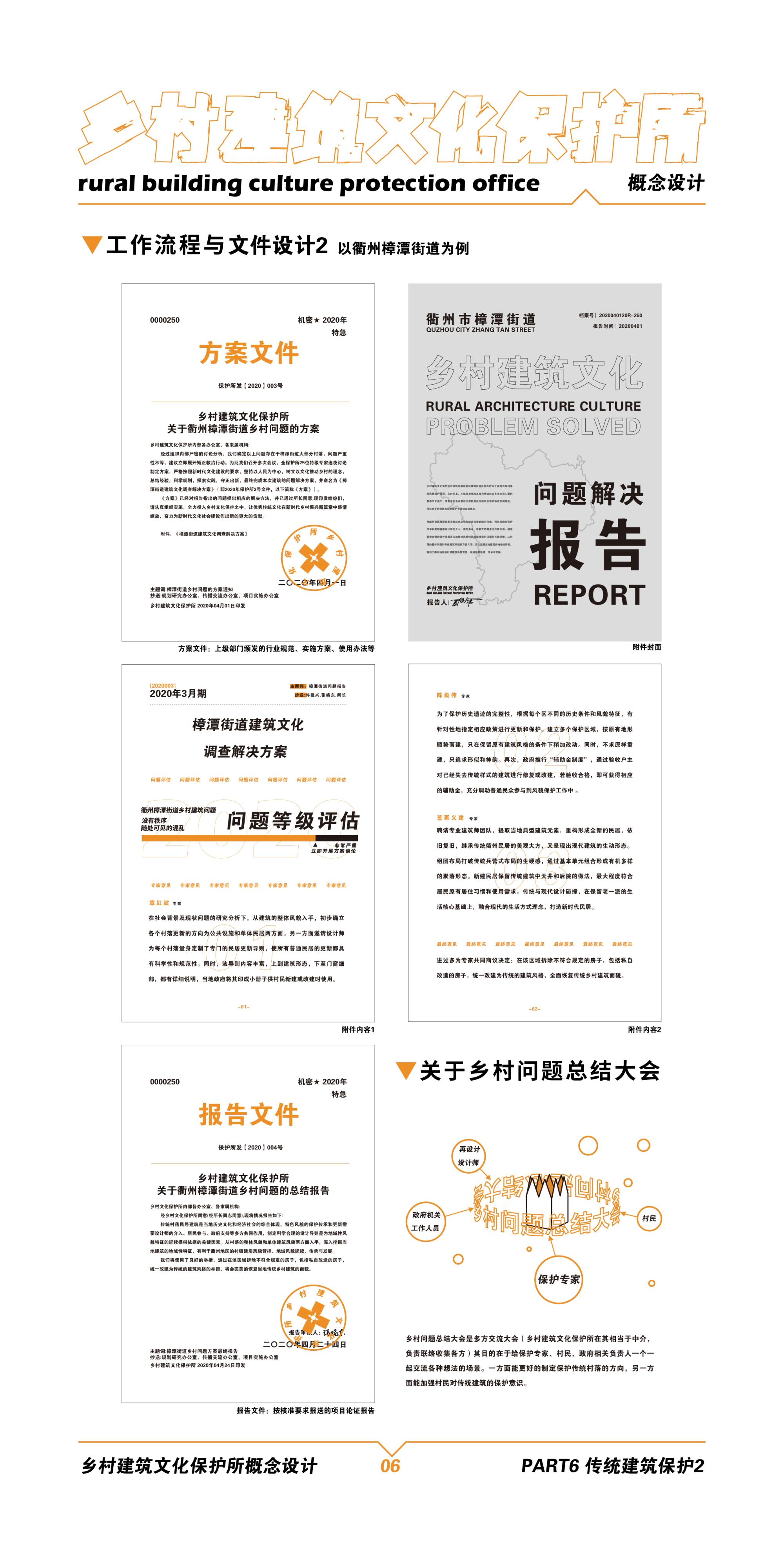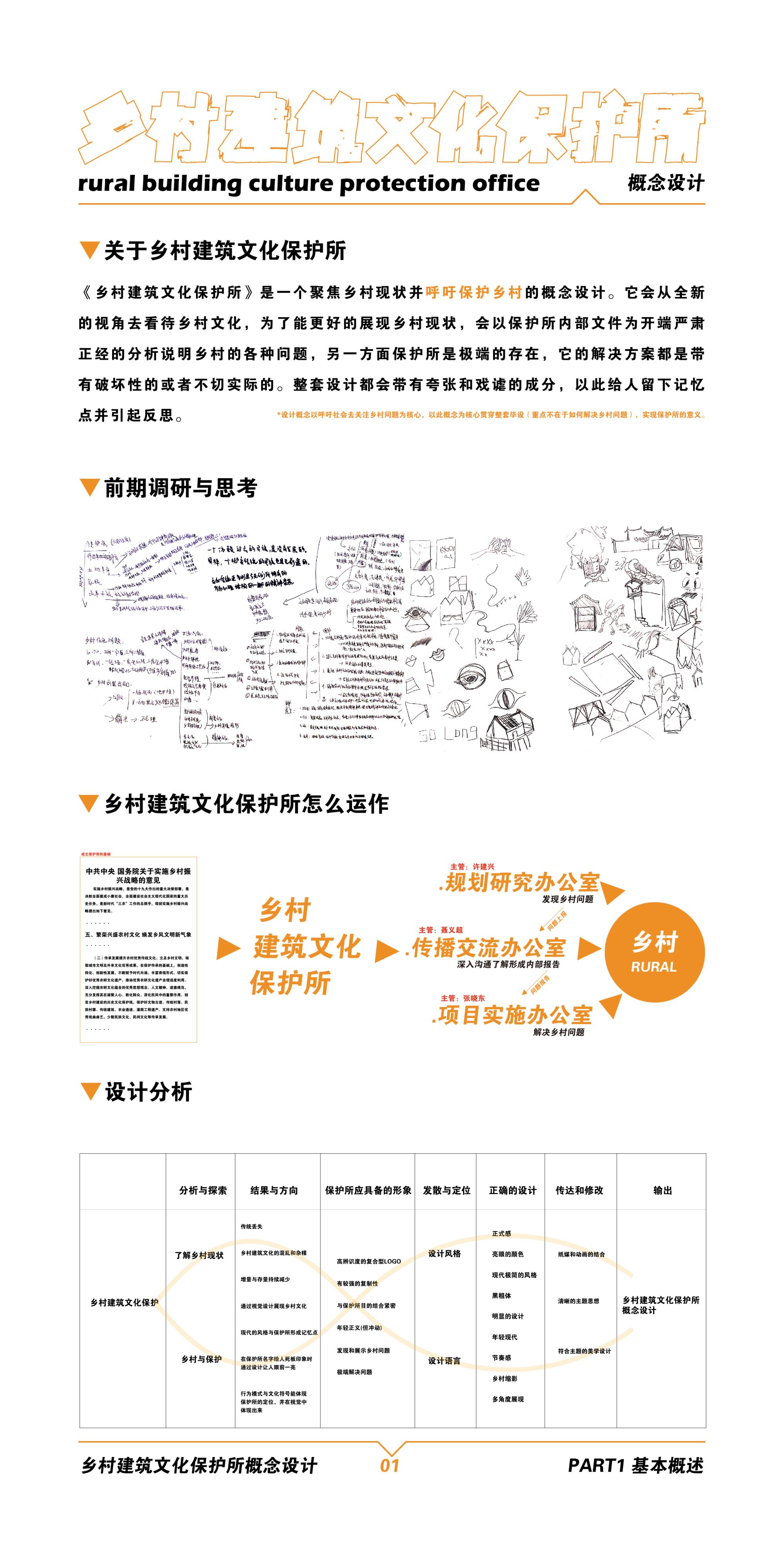 《乡村建筑文化保护所》是一个聚焦乡村建筑文化现状并呼吁保护乡村建筑的概念设计。它会从新的视角去看待乡村,为了能更好的展现乡村建筑现状,会以保护所内部文件为开端严肃正经的分析说明乡村的各种问题,另一方面保护所是极端的存在,它的解决方案都是带有破坏性的,以此给人留下记忆点并引起反思。