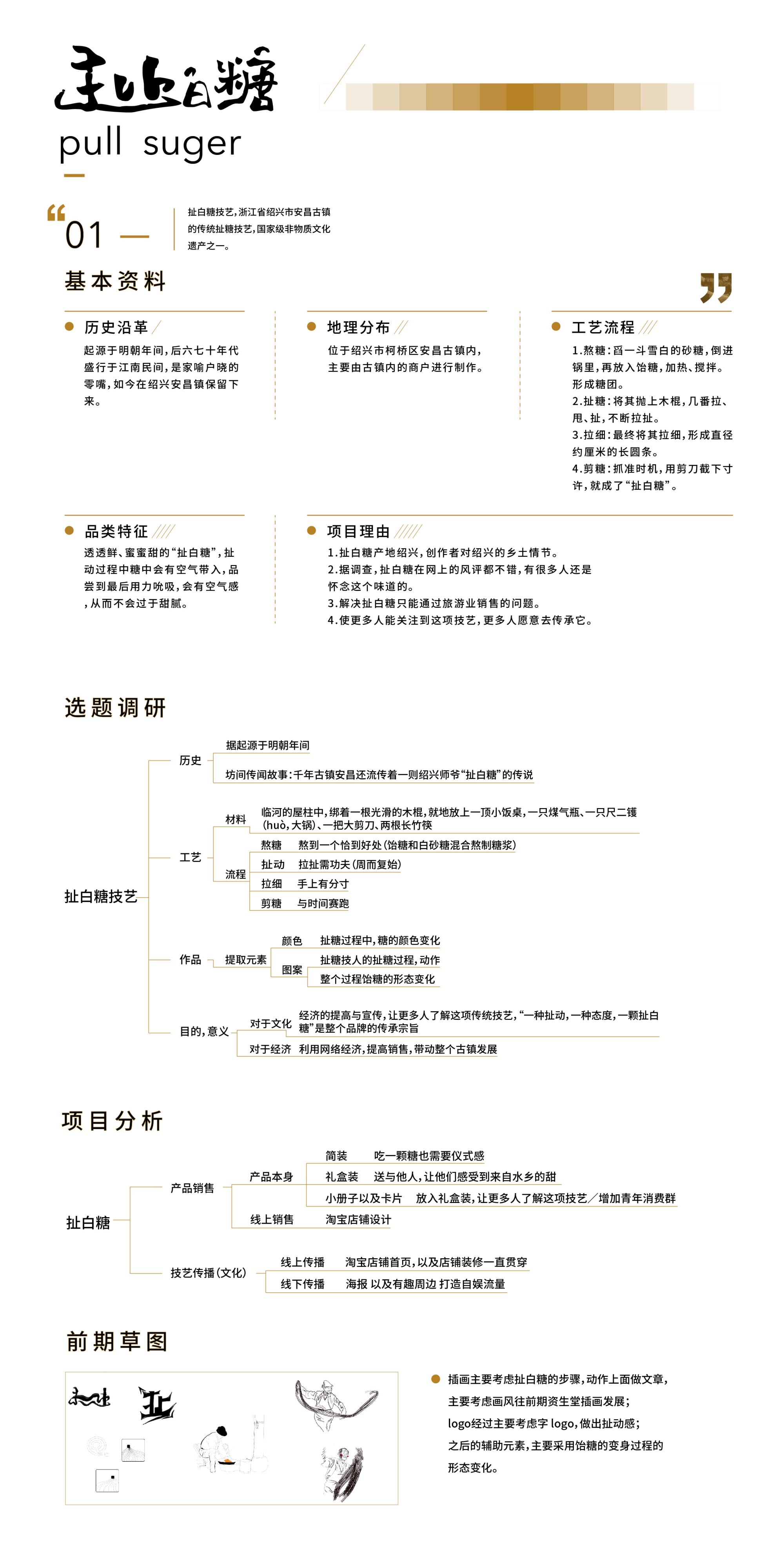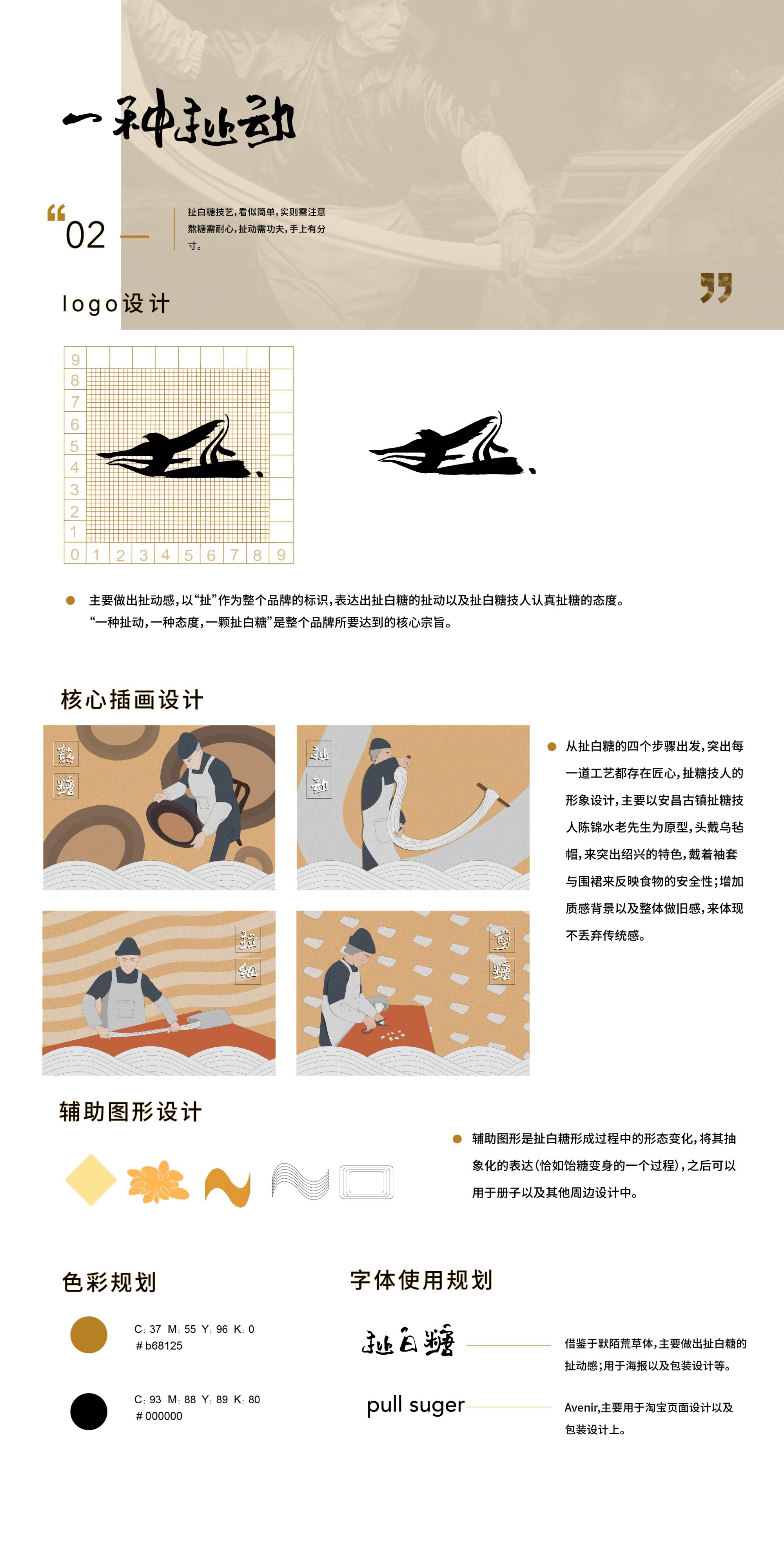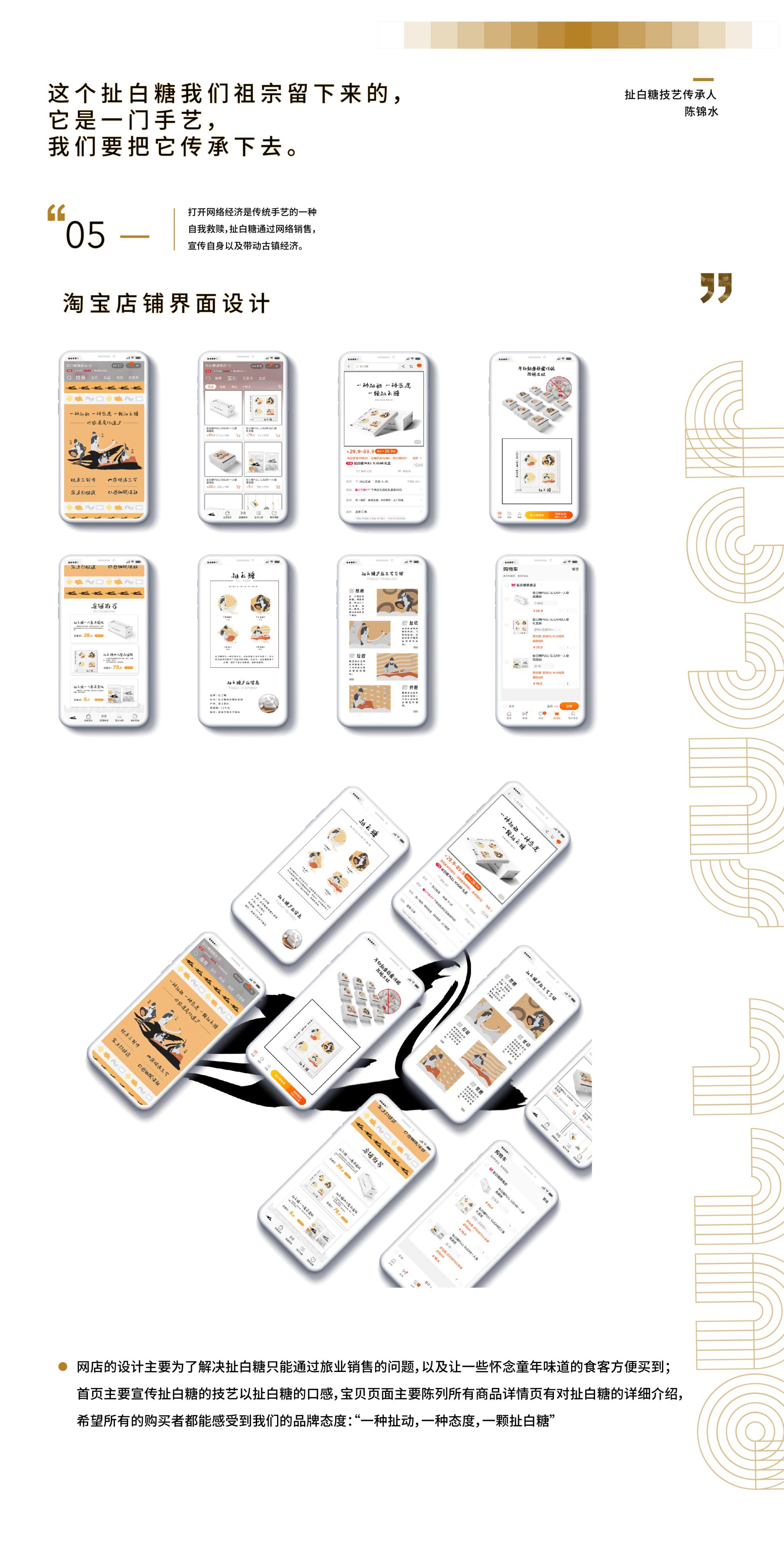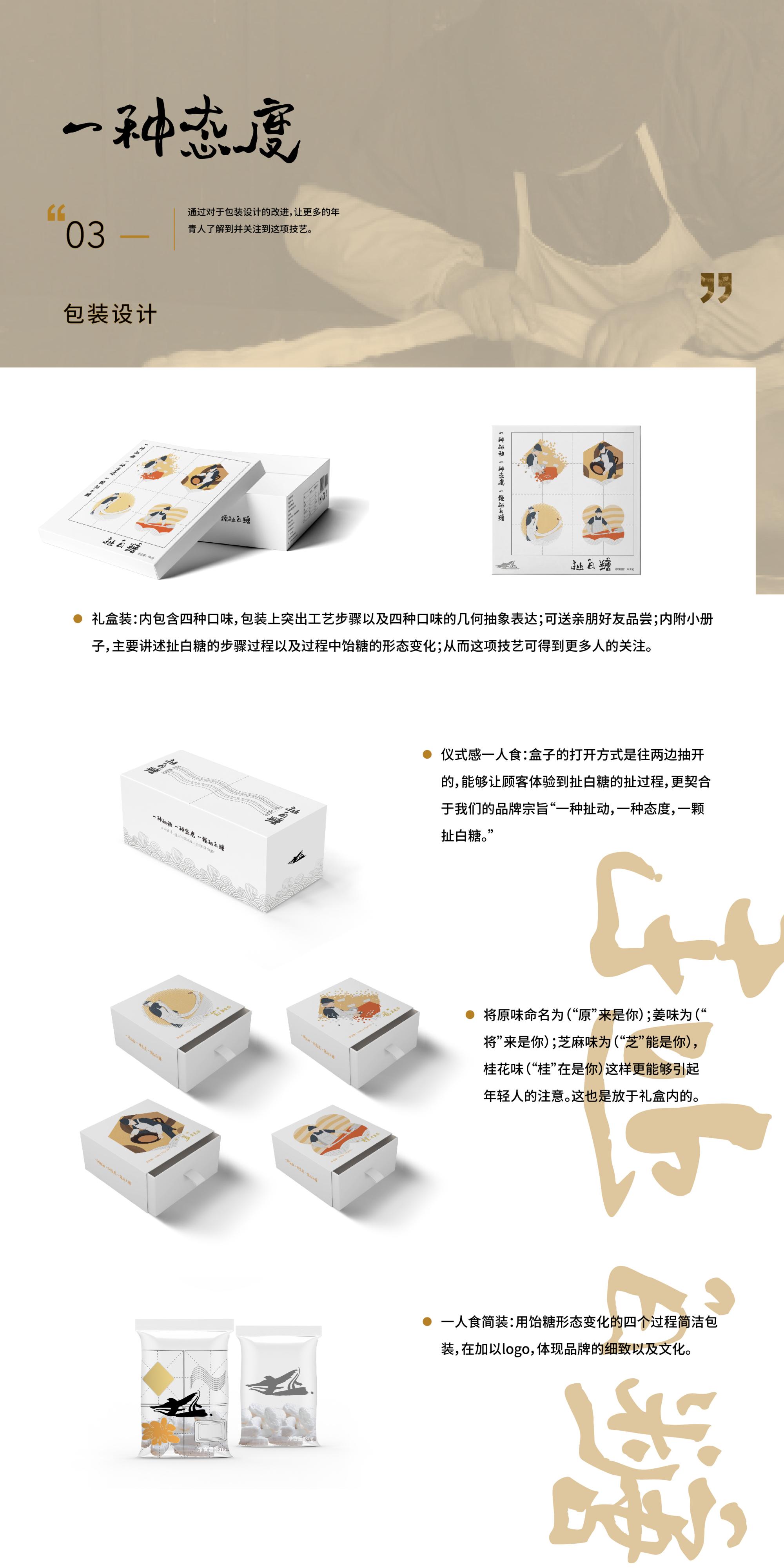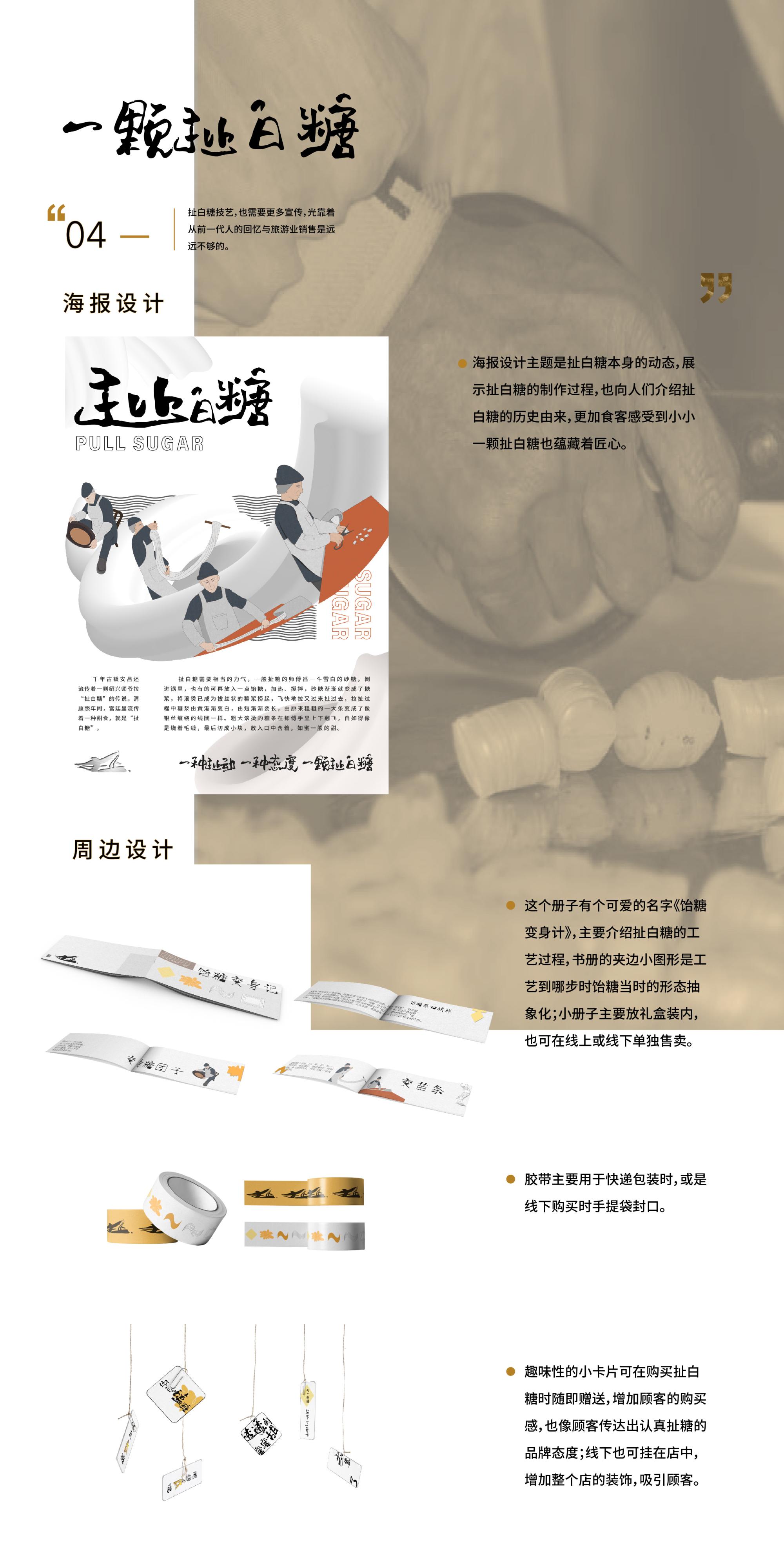 在网络经济盛行的时代,传统技艺及商品渐渐被遗忘及丢弃,扯白糖这一传统小吃也只能通过旅游业对外销售;为改变这一状况,对其包装、网店等进行设计,如此创新设计后,带动其经济从而让更多的人愿意传承这项技艺以及做到对这项技艺的了解;“一种扯动 ,一种态度,一颗扯白糖”,这是我们整个设计所要传达的。