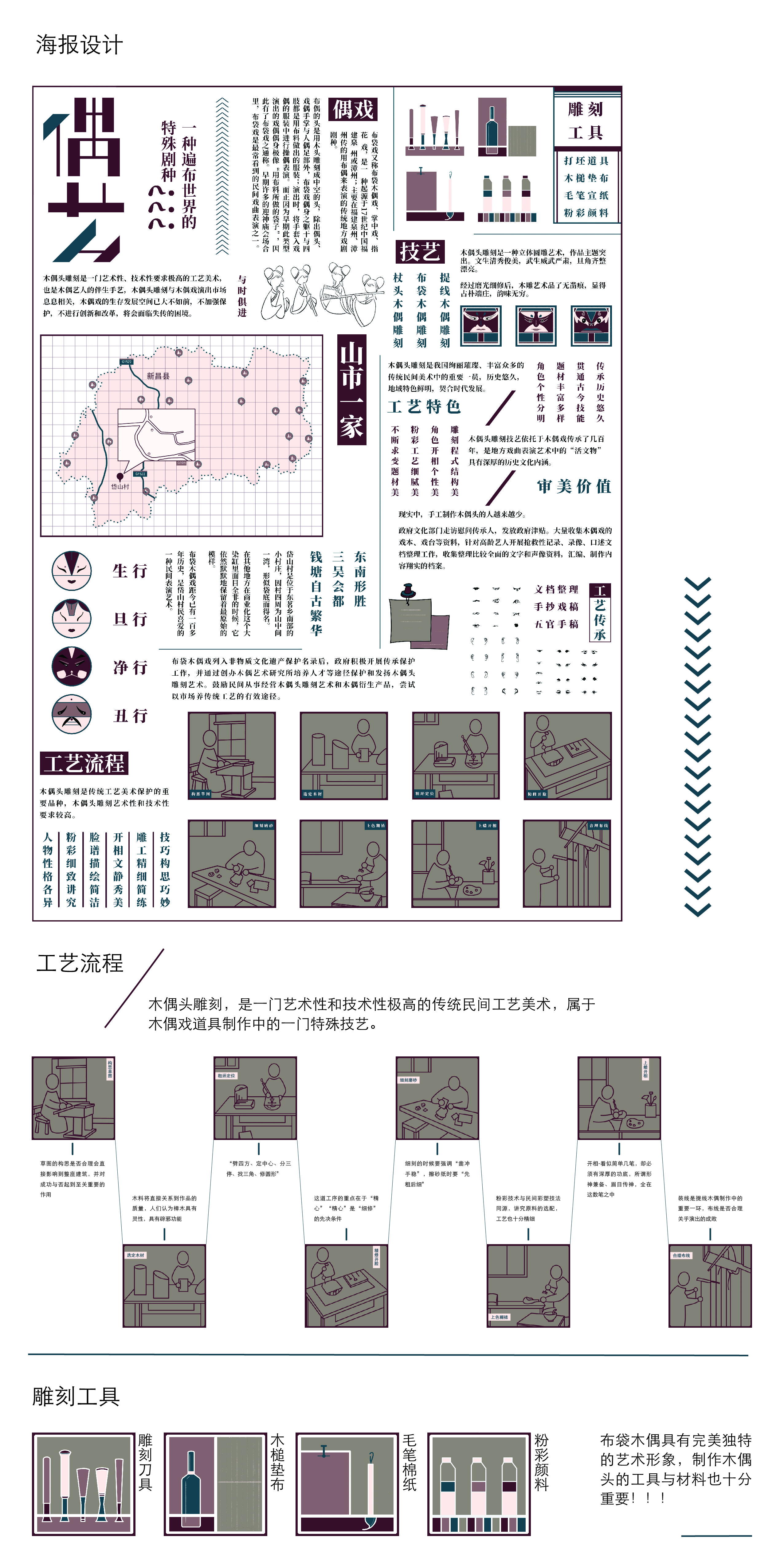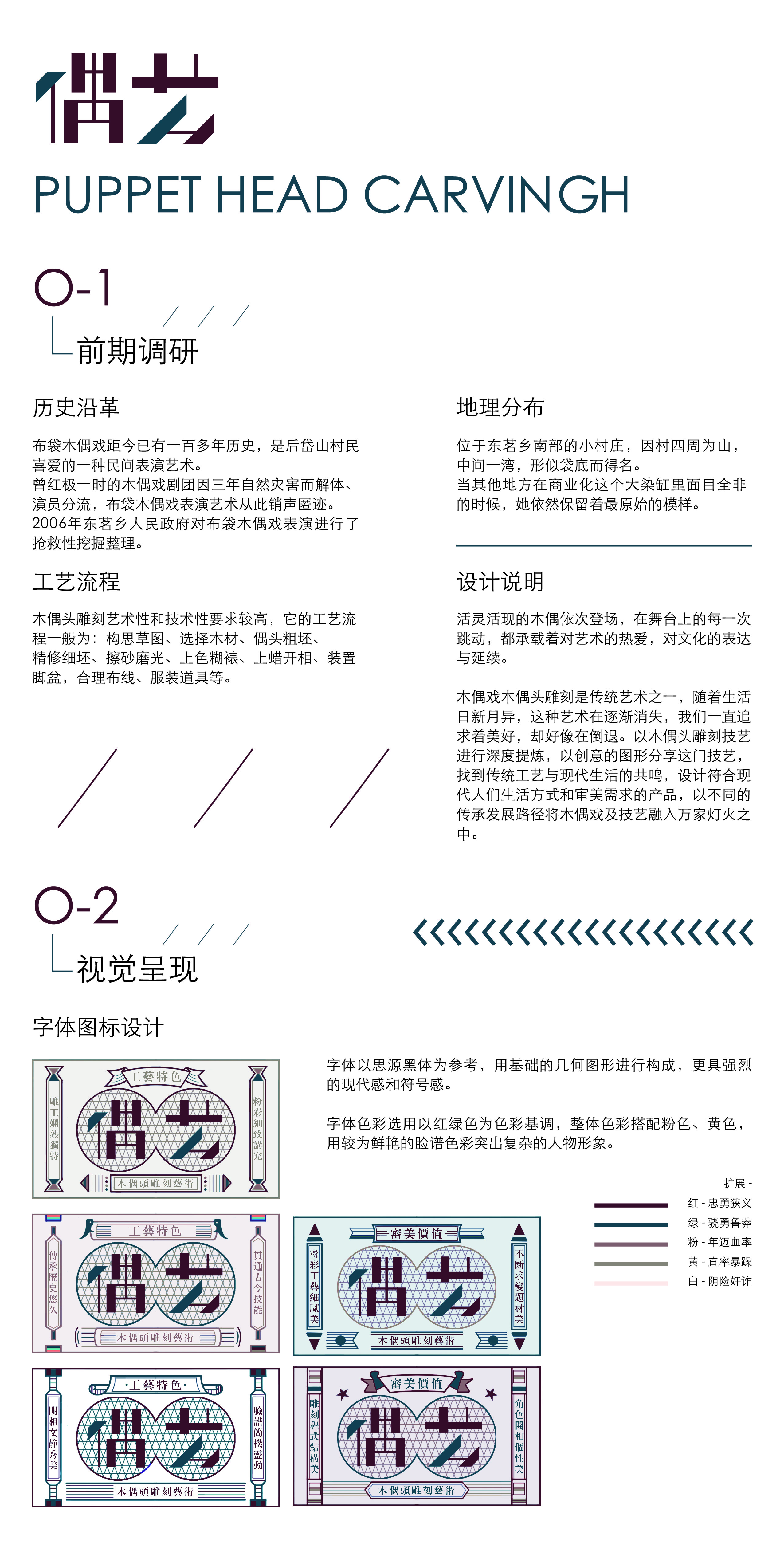 活灵活现的木偶依次登场,在舞台上的每一次跳动,都承载着对艺术的热爱,对文化的表达与延续。木偶戏与木偶头雕刻是传统艺术之一,随着生活日新月异,这种艺术在逐渐消失,我们一直追求着美好,却好像在倒退。以木偶头雕刻技艺进行深度提炼,以创意的图形分享这门技艺,找到传统工艺与现代生活的共鸣,设计符合现代人们生活方式和审美需求的产品,以不同的传承发展路径将木偶戏及技艺融入万家灯火之中。