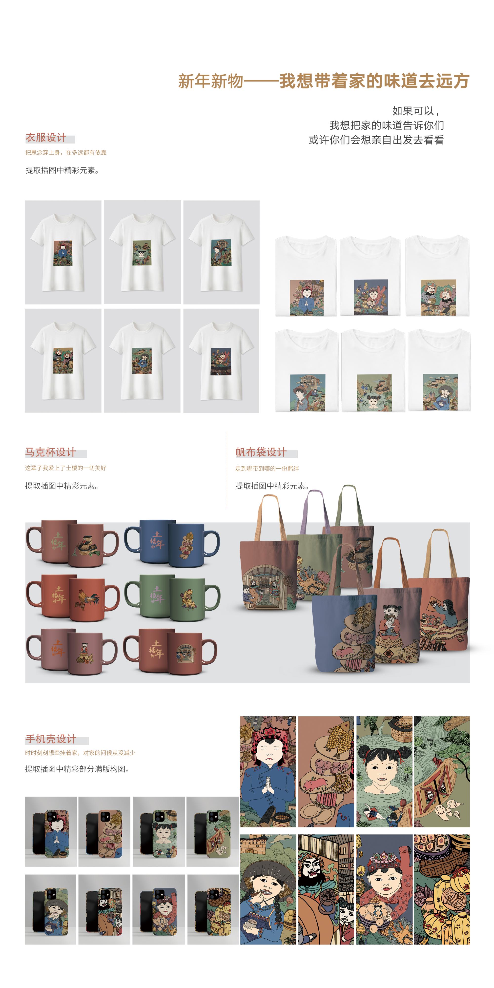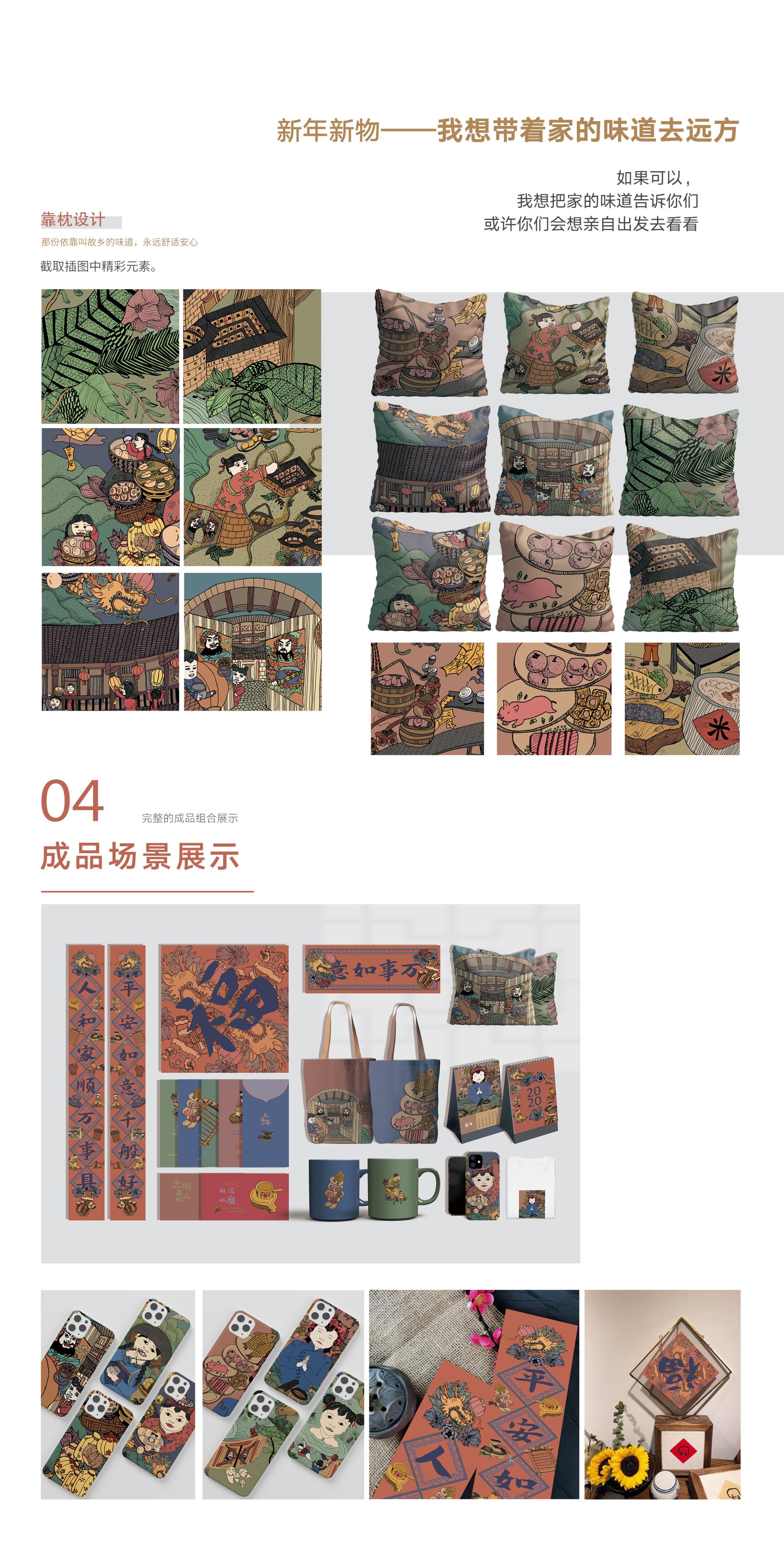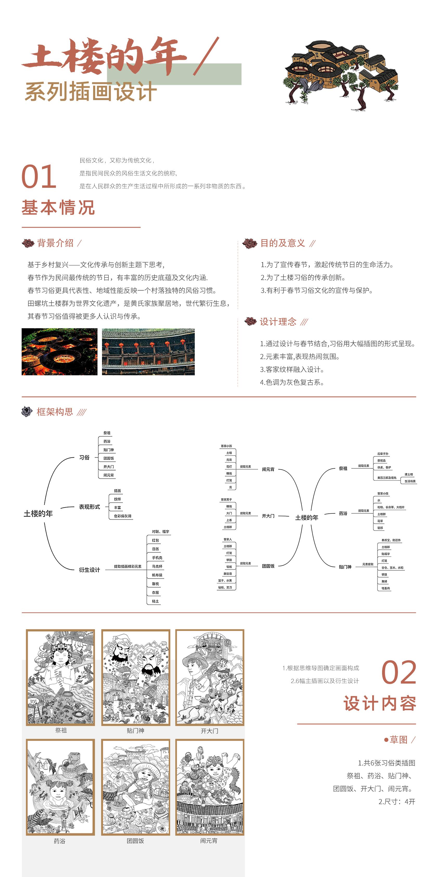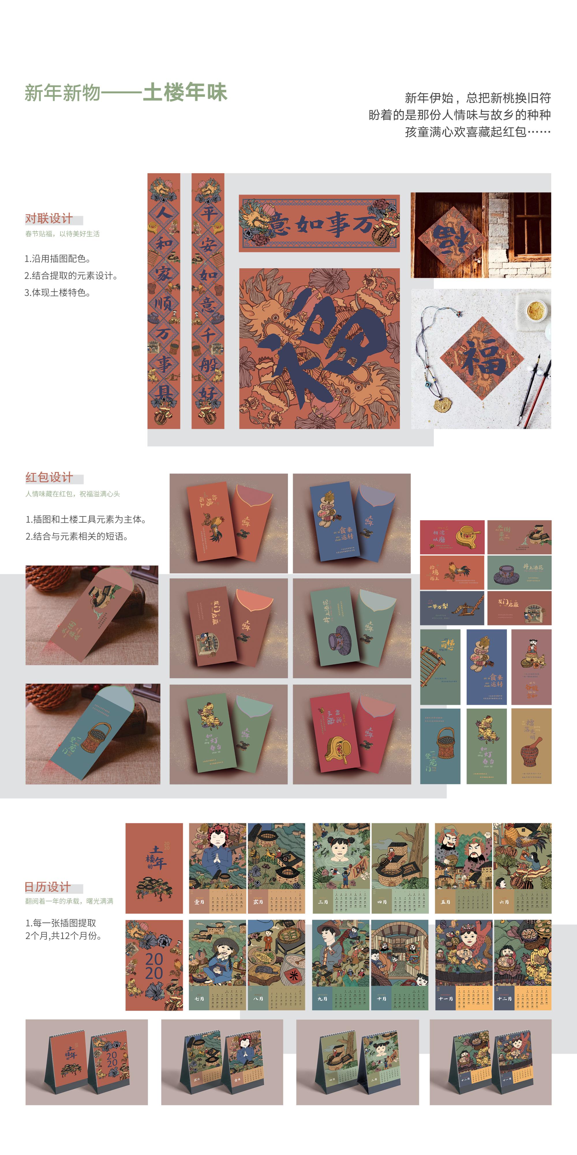 基于毕设大主题“乡村复兴计划—文化传承与创新”,我选择以田螺坑土楼为载体进行设计。《土楼的年系列插画》将土楼里过年的习俗用场景插画的形式表现出来,6幅插画以4开幅面展现,选取丰富的造型元素、纹样,融入视觉表现中,色调不同于传统的大红色过年基调,以灰色复古系为主营造雅致传统的土楼氛围。周边设计以6幅插画为基础展开,呈现协调丰富的最终效果。用设计体现客家过年特色,传承民俗文化,使更多人得到普及和共鸣。
