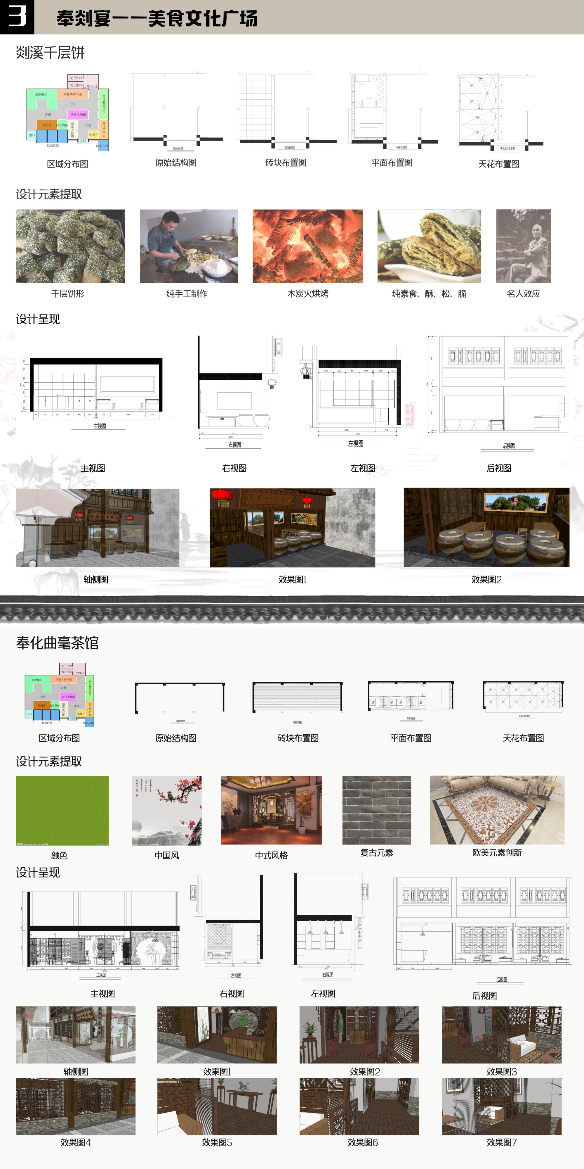 “奉剡宴”美食文化广场的设计以溪口民国风情街为中心,辐射周边各地方特色美食,实现当地特色旅游文化及特色美食文化的完美融合。通过美食及展示内容的呈现,充分实现各美食小吃色、香、味、形、民俗习惯及历史典故的完美表现,让人们更好的去体会美食及地区文化的美。