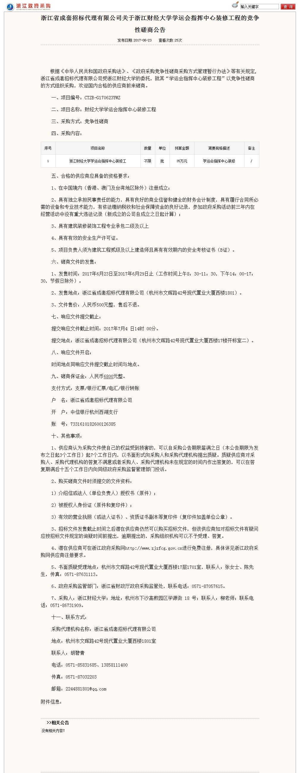上一条:【ZJPEC-CJ-63】ued体育 智慧教务综合服务平台项目的竞争性磋商公告下一条:【ZJOB-20170619】ued体育 临时放松池风雨棚项目的竞争性磋商公告