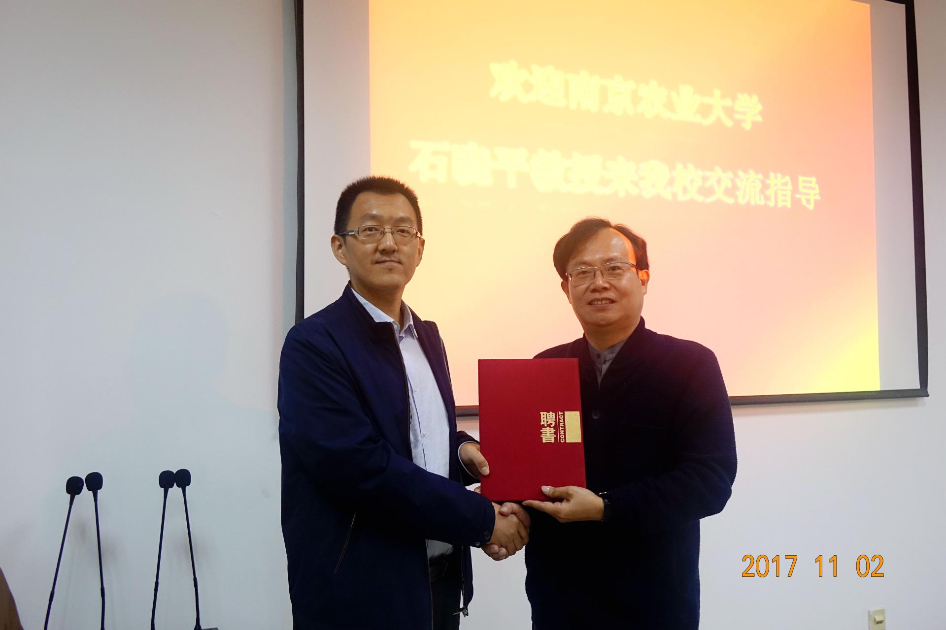 近日,南京农业大学公共管理学院院长、博士生导师石晓平教授受聘为我校兼职教授,黄建新副校长出席聘任仪式并为石晓平教授颁发了聘书。聘任仪式结束后,石晓平教授为出席聘任仪式的师生们作了题为“工业用地供应的地方制度供给研究”的学术报告。