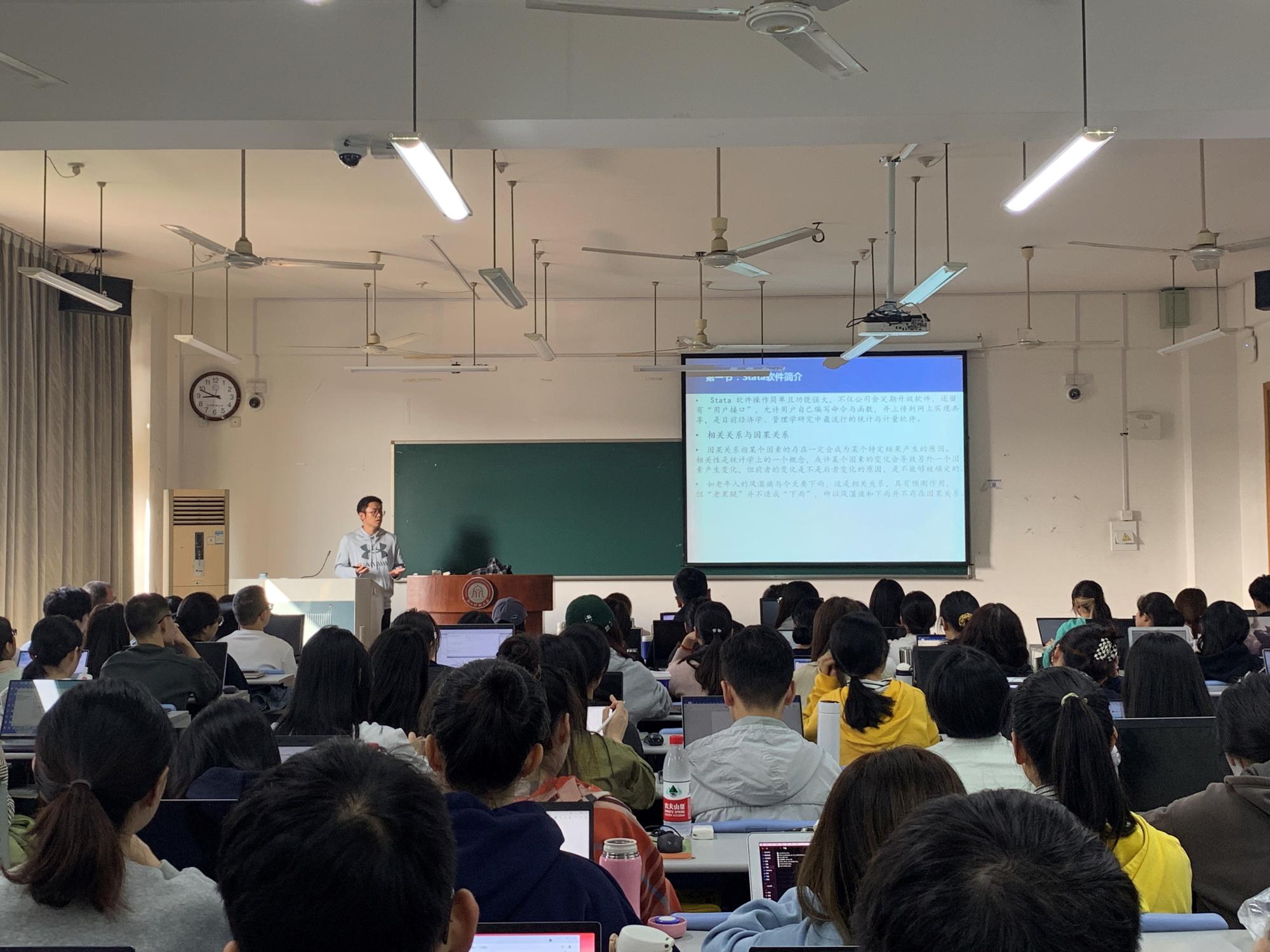 随后,负责Stata软件操作专题的陈文强老师给大家讲解了因果推断的重要性、Stata软件的简介和简单的数据处理。最后,方军雄老师以《会计准则变更的经济后果研究》为主题给学生们介绍了会计准则变更的动因及后果等问题。在讲座过程中,方老师渊博的知识和风趣的风格给学生们留下了深刻的印象。