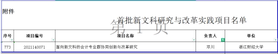 近日,《教育部办公厅关于公布首批新文科研究与改革实践项目的通知》(教高厅函〔2021〕31号)正式印发。经单位推荐、网络审核、会议审议等程序,教育部共认定首批1011个新文科研究与改革实践项目。我院《面向新文科的会计专业群协同创新与改革研究》荣获立项。