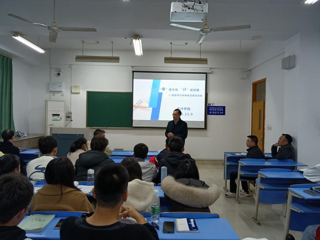 12月9日晚,会计学院院长邓川、副院长李宗彦、审计系主任陈效东、会计大数据教育中心主任董黎明、班主任季伟伟与21智能审计创新班30位同学在A411教室围绕“‘审’谋方向 ‘计’谋发展”主题开展师生交流讨论会。交流会由陈效东老师主持。