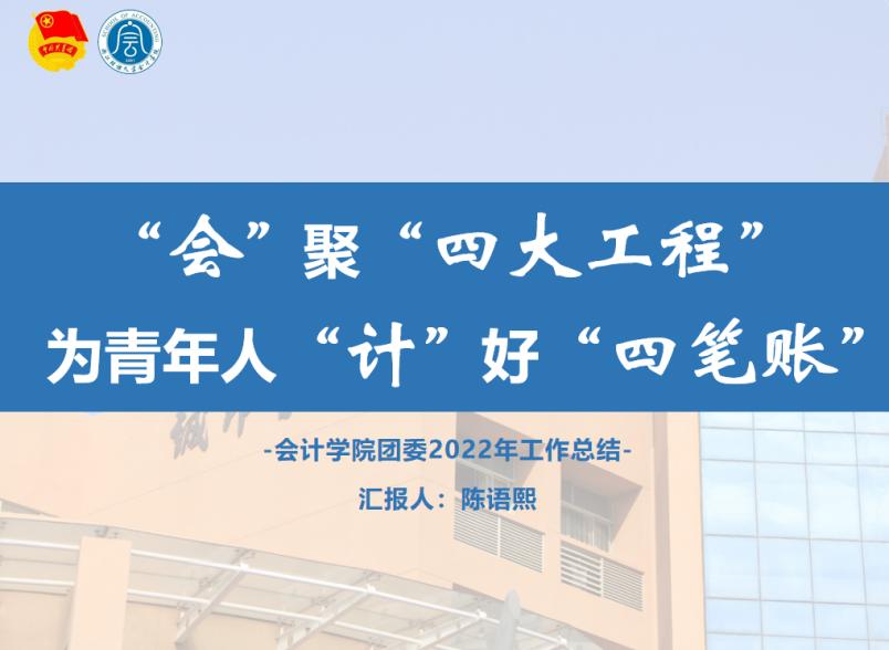 2022年,在学院党委和校团委的正确领导和关心支持下,会计学院团委坚持立德树人的根本使命,融入“三全育人”大思政格局,围绕思想引领,组织建设,学术研究,社会实践等育人重点,打造“四大工程”,为会院青年记好“四笔账”,服务青年成长。