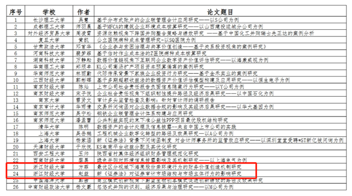 近日,全国会计专业学位研究生教育指导委员会公布了2023年全国MPAcc优秀学位论文评选结果。我院研究生方菲同学撰写的《最优区分视域下海亮股份亲环境行为的财务价值创造机制研究》(指导教师:赵宇恒、陈东),以及赵益同学撰写的《新《证券法》对证券审计市场结构与市场主体行为的影响研究》(指导教师:邓川、郑耀祥)位列其中。