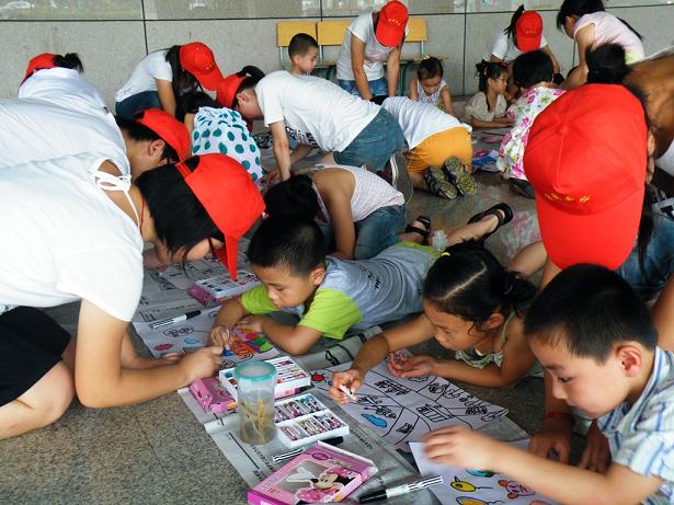 7月10日,实践团队员与桐乡市少年宫的小朋友们一起携手,用绘画的方式表达自己对家乡伟大变化的欣喜与祖国母亲六十华诞的祝福。