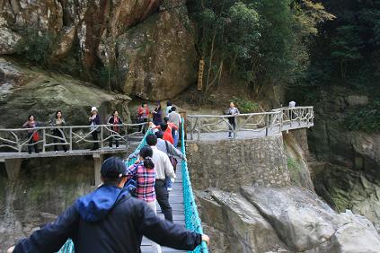 第二天上午游览了浙东大峡谷。大峡谷以“雄、奇、险、幽”著称,多急流、飞瀑,形态各异、多采多姿的溪坑巨石星罗棋布于溪涧之中,峡谷两岸,千年古树在悬崖峭壁之上横空而出,如苍剑挥舞。大峡谷秀美的景色使得每一位游人都流连忘返。
