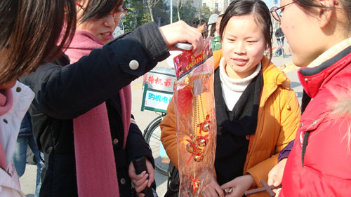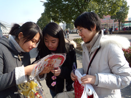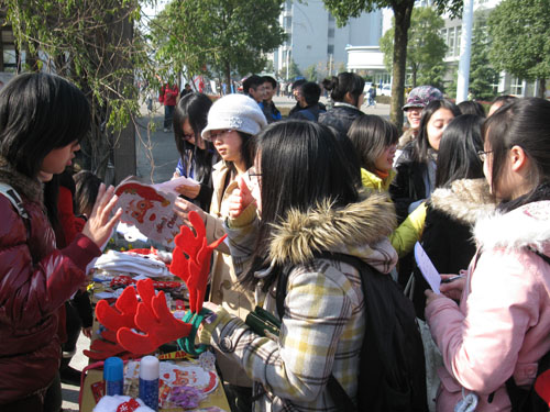 中午12点30分,多数参赛者已早早聚集在位于文化长廊的活动地点。工作人员进行点名后,参赛者以3至4人一组的规模组成了8个小组。理财学会提供了活动所需的丰富多彩的圣诞饰品,并将各类饰品按照价格分成4堆。每个小组的组长根据抽签顺序依次选取各自认为好卖的圣诞物品。一时间,参赛者的手中拿满了圣诞帽、圣诞铃铛、圣诞老人玩偶等物品。现场洋溢起浓浓的火红色暖意,浓得化不开,大家的热情仿佛化解了冬日的严寒。下午1点,8个参赛小组出发开展他们的爱心活动。有的小组决定在人流密集的西门口展开攻势,有的小组则选择了深入广阔的桃李生活区。参赛者们热情地向过往同学介绍圣诞饰品并推广活动意义,鼓励同学们为爱心基金会献出一片爱心。还有同学运用自己广泛的人脉,请来了朋友支持活动。随后不少班级派出的班级圣诞采购团隆重登场,大大增加了购买力。比赛由此进入白热化。