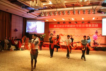 校党委副书记朱永康代表学校向我院教职工致以亲切的问候和诚挚的祝福。会计学院院长汪祥耀回顾了2009年会计学院取得的成绩,并勉励全院教职工共同努力,在新的一年中再创佳绩、再续辉煌。党总支书记邵毅平对大家在过去一年里的辛勤工作和无私奉献表示衷心的感谢。随后迎新活动在优美的乐曲声中正式开始。表演者充分展示才艺,歌曲、小品、游戏等节目精彩纷呈、高潮迭起。张颖老师的演唱的《我爱你,中国》、郭德贵等老师自编自说的三句半、国际会计系表演东北秧歌、女教授集体表演的时装秀等节目特色鲜明、水平较高,深得老师们的喜爱,邱学文老师边唱边演的《冬天里的一把火》更是把晚会推向了高潮。