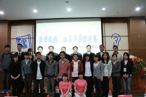 4月25日晚,浙江财经学院第五届读书节系列活动之“温情流转,励志书籍”演讲在图书馆五楼报告厅隆重开场。比赛邀请了人文学院姜岳斌教授、王明建教授,图书馆馆长张守凯等担任评委。时间刚过6点,报告厅门口就排起了长队。同学们纷纷系上黄丝带,在画有玉树的地图上签名,为灾区人民祈福。6点30,全场座无虚席,演讲赛在会计学院学生爱心基金会手语表演《风色幻想》中拉开序幕,荧光闪闪的手指挥舞着灵动的奇迹。