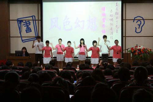 本次比赛由“先声夺人”和“speak show”组成,未见其人,先闻其声,选手的出场别具一格,或是浑厚的声音,或是轻柔的问候,选手们想用自己的声音来代替盲人的眼睛,来替盲人感受世界。灯光打亮舞台,选手出场,激昂的语调,饱满的感情,动人的言语,无不闪烁着思想和情感的火花,感染着在场的评委和观众,就选手的精彩表现,评委们给予了高度评价。比赛激情洋溢,体现我校青年学生的良好风貌,同时还情系玉树,在为玉树加油——祈福活动中,全场观众默哀一分钟,在烛光里,用手中的黄丝带为玉树人民祈福。此次选手的声音将由学生爱心基金会录成CD送给杭州聋哑学校的盲童,这爱的声音承载了我们广大师生对盲人的关爱与祝福。
