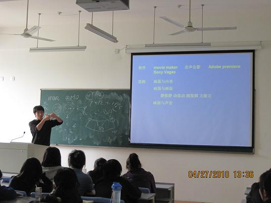 王逸超学长作为前任启光社社长,有着丰富的DV拍摄经验。丰富的肢体语言与风趣的口头表达能力,将这节课渐渐的引入佳境。拍摄机器的调试和DV剪辑所需要的软件等等,学长都一一向大家进行了介绍,并拿出了一些他自己使用的工具,供同学们参考。而在实例讲解方面,学长为大家播放了一个婚礼的DV,并就这个婚礼DV中一些可取的拍摄及剪辑要点进行了具体而形象的说明。此外,学长借由相机,讲解了一些拍摄出特别镜头视角的姿势,并做了实地的演示。这些都为台下的同学们扩宽了视野,更多地汲取了拍摄的知识。