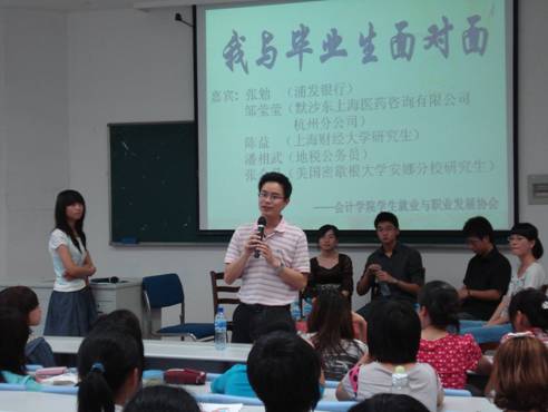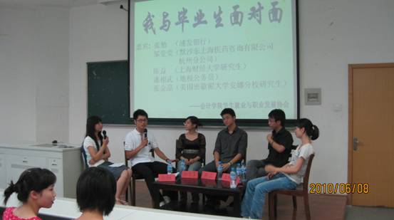 为了让同学们对自己的大学生职业生涯有一个合理的规划,6月8日下午,在会计学院楼111教室举办了一场别开生面的“我与毕业生面对面”交流会活动。活动邀请了五位2010届优秀毕业生——张勉、邹莹莹、陈益、潘相武、张金晶与我们一同分享了他们在就业、考研以及考公务员中的经历。会计学院党总支副书记张红英老师、会计学院分团委陆建良老师作为嘉宾出席了本次活动。